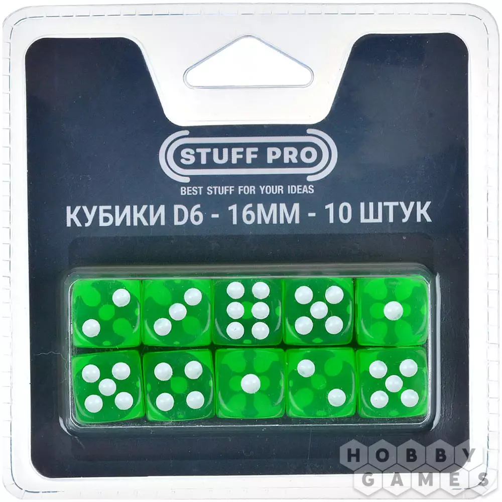 Набор прозрачных кубиков D6 Stuff Pro, 10 шт. (16 мм, зелёные)