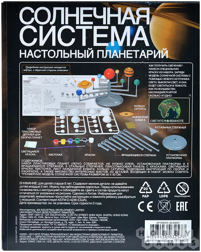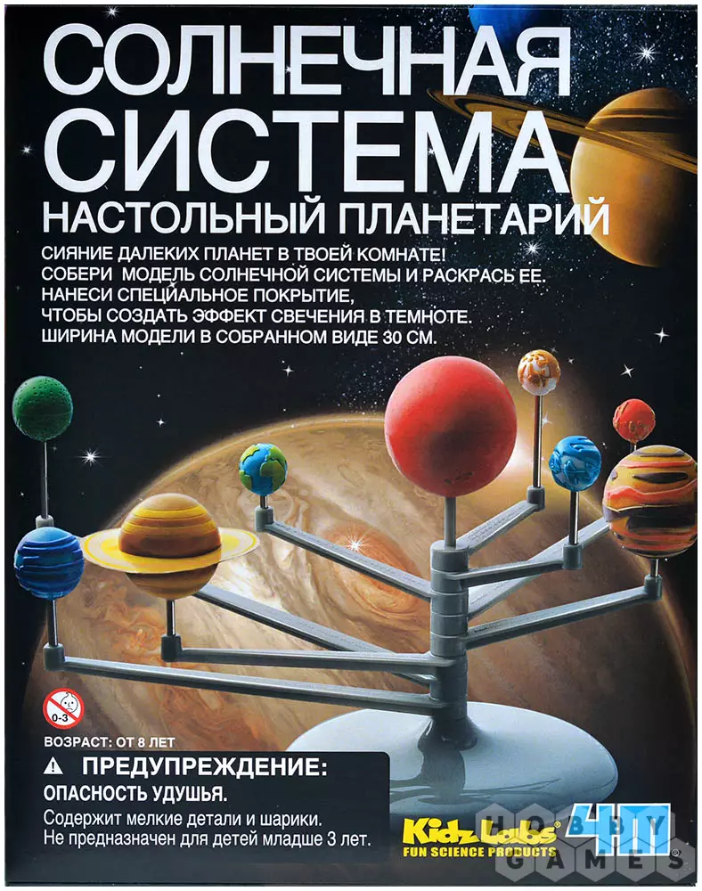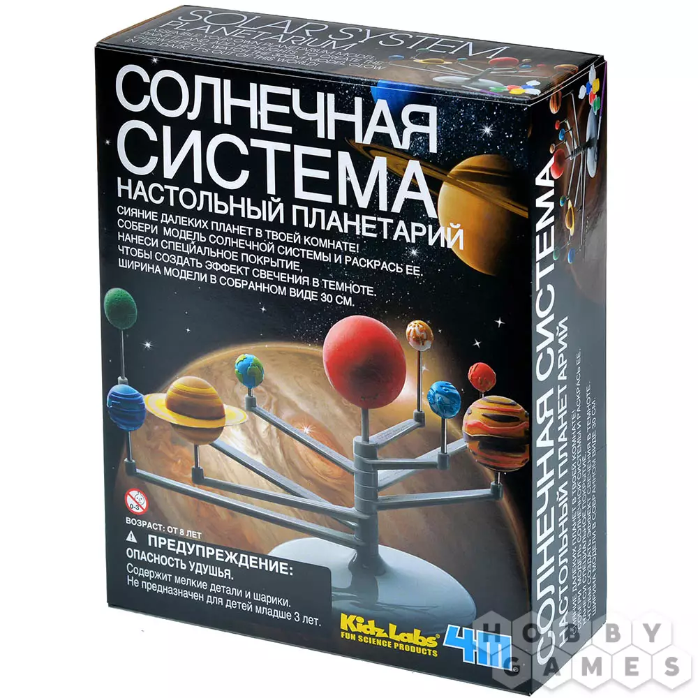 Для тех, кто хоть раз посещал планетарий, восхитительные танцы планет остаются в памяти незабываемым зрелищем. А что если воссоздать подобное чудо прямо у себя дома? В достижении этой цели вам и вашему ребёнку поможет набор "Солнечная система". Вы сможете собрать трёхмерную модель Солнечной системы, включающую в себя 8 планет и Солнце. Планеты могут вращаться вокруг звезды по орбитам. После сборки вы можете окрасить модель, а флуоресцентная краска, включенная в комплект, добавит эффект свечения, превратив вашу модель в волшебное украшение. Выключите свет и насладитесь завораживающим видом космоса. Изучите структуру Солнечной системы более подробно с помощью прилагаемой обучающей инструкции, которая расскажет вам множество интересной информации о каждой планете.