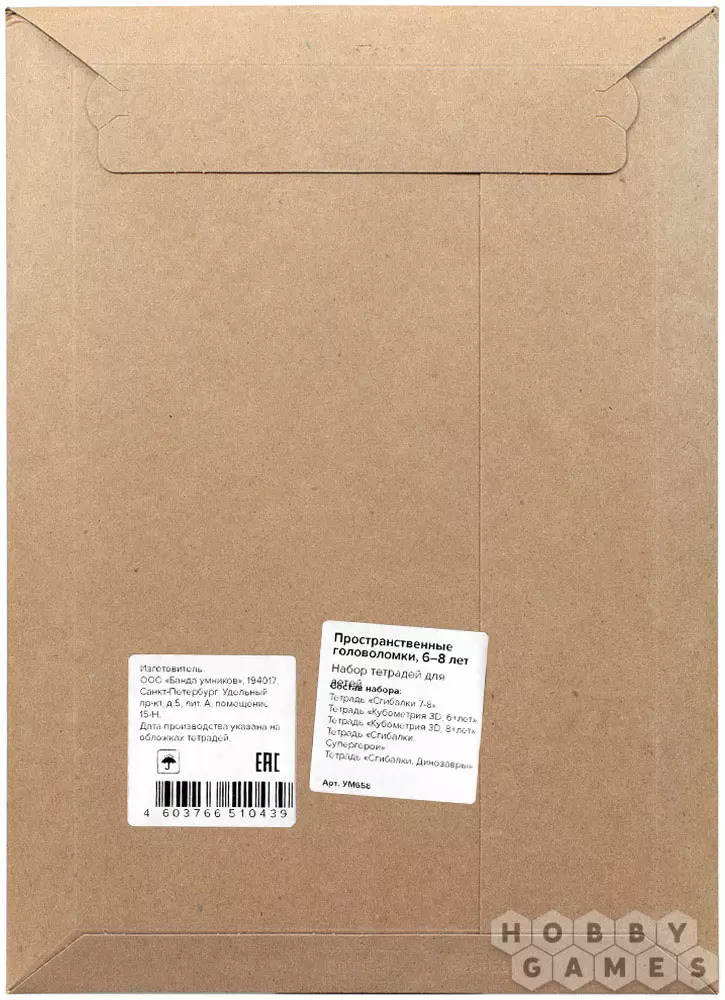 Набор содержит пять тетрадей с бумажными головоломками, выполняя которые ребёнок будет в игровой форме развивать своё пространственное и логическое мышление. Одни головоломки нужно будет вырезать, в других сгибать лист бумаги для получения определённого узора или рисунка, а в головоломках из тетрадей "Кубометрия" предстоит собирать конструктор – но не из настоящих кубиков, а из их стереометрических проекций.