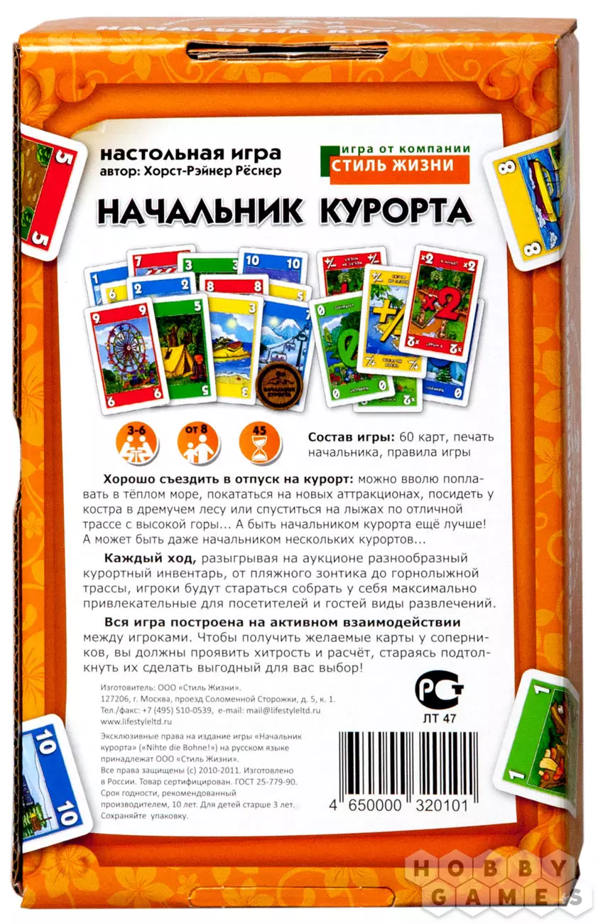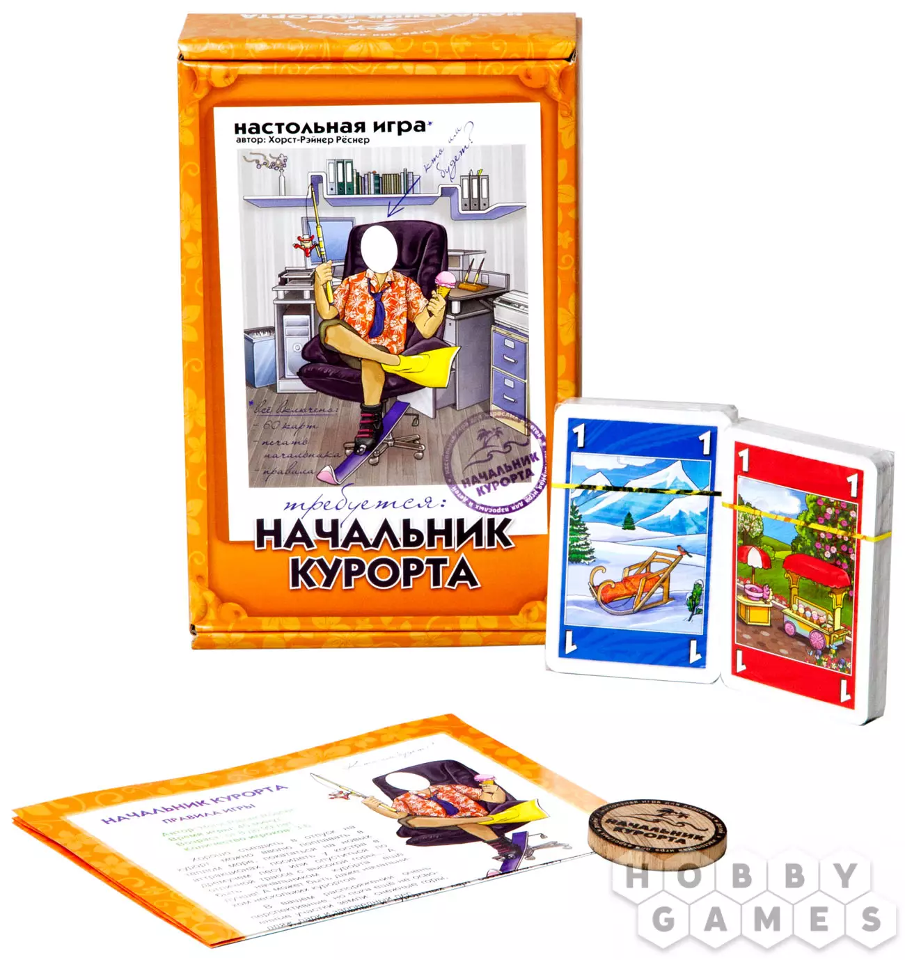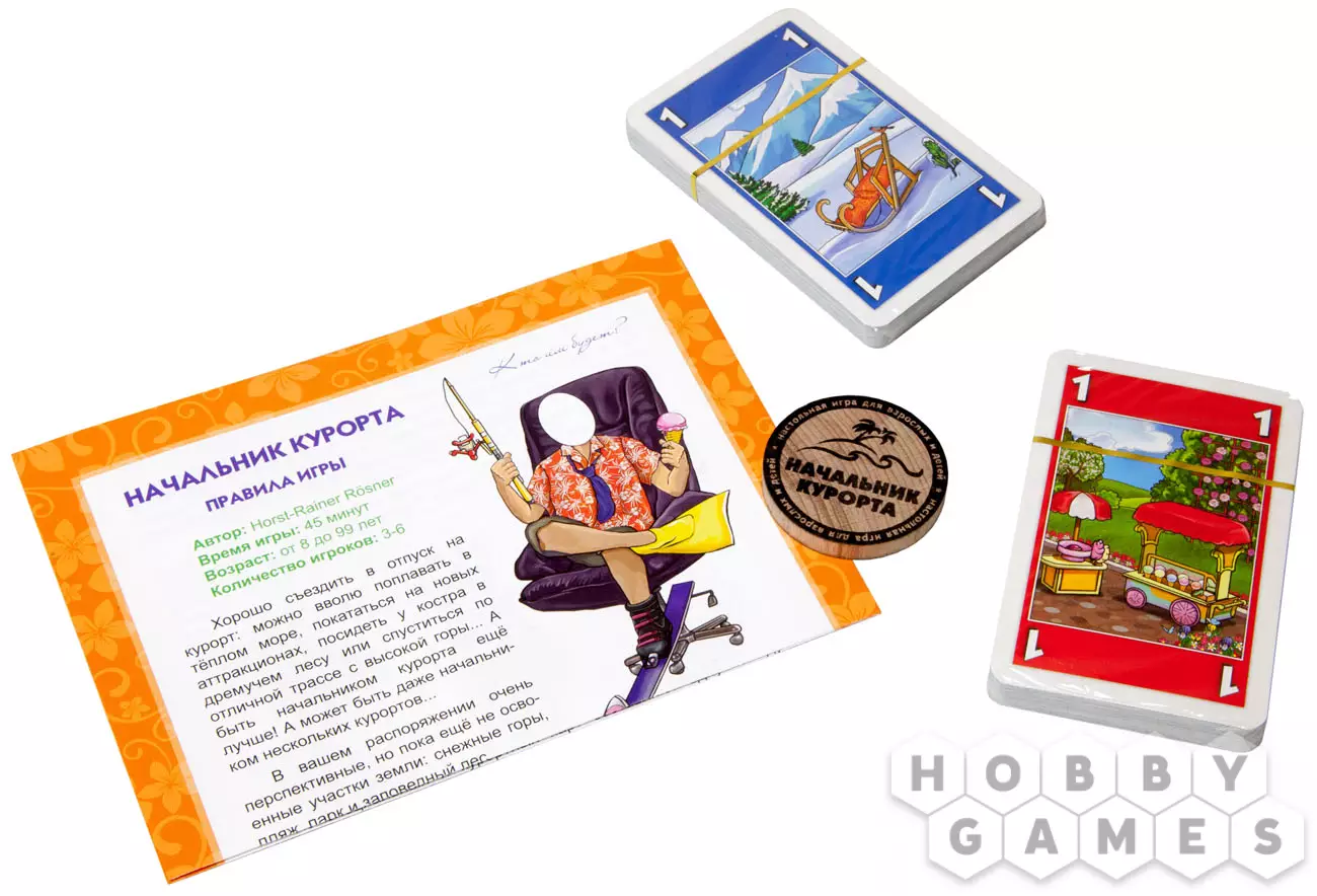 Игра "Начальник курорта" для тех, кто хочет побыть в роли настоящего руководителя! Каждый ход, разыгрывая на аукционе разнообразный курортный инвентарь – от пляжного зонтика до горнолыжной трассы, игроки будут стараться собрать у себя максимально привлекательные для посетителей и гостей виды развлечений. Вся игра построена на активном взаимодействии между игроками. Чтобы получить желаемые карты у соперников, вы должны проявить хитрость и расчёт, стараясь подтолкнуть их сделать выгодный для вас выбор.