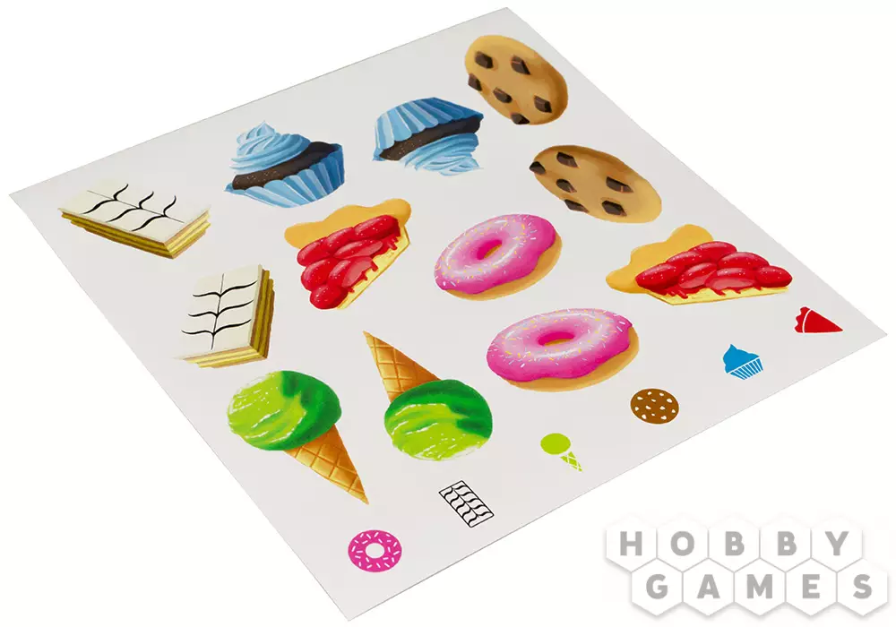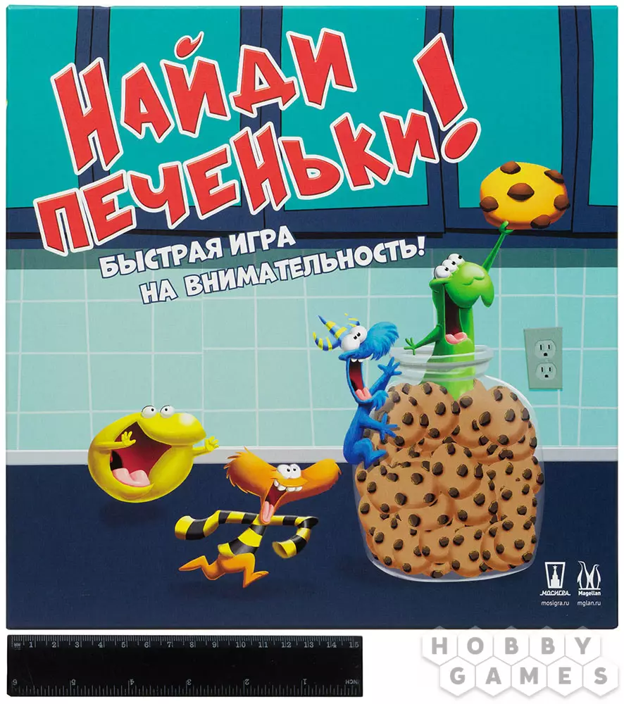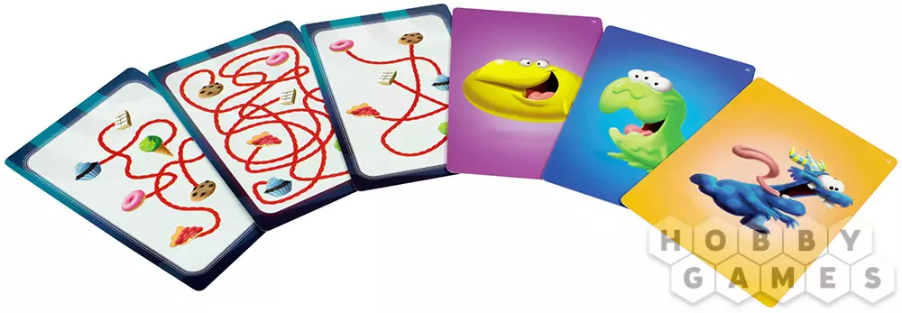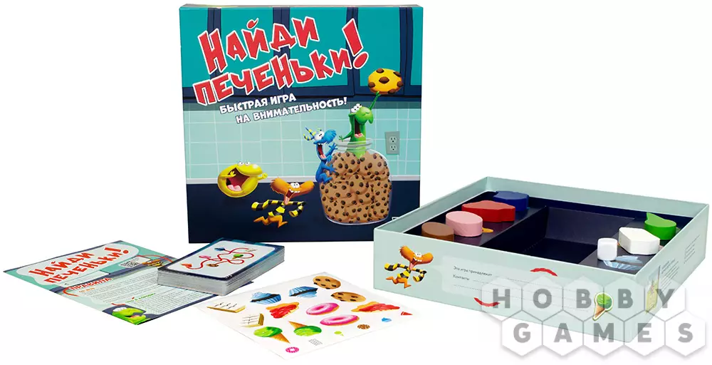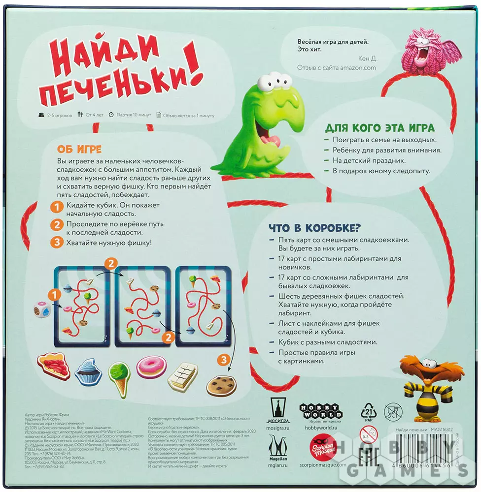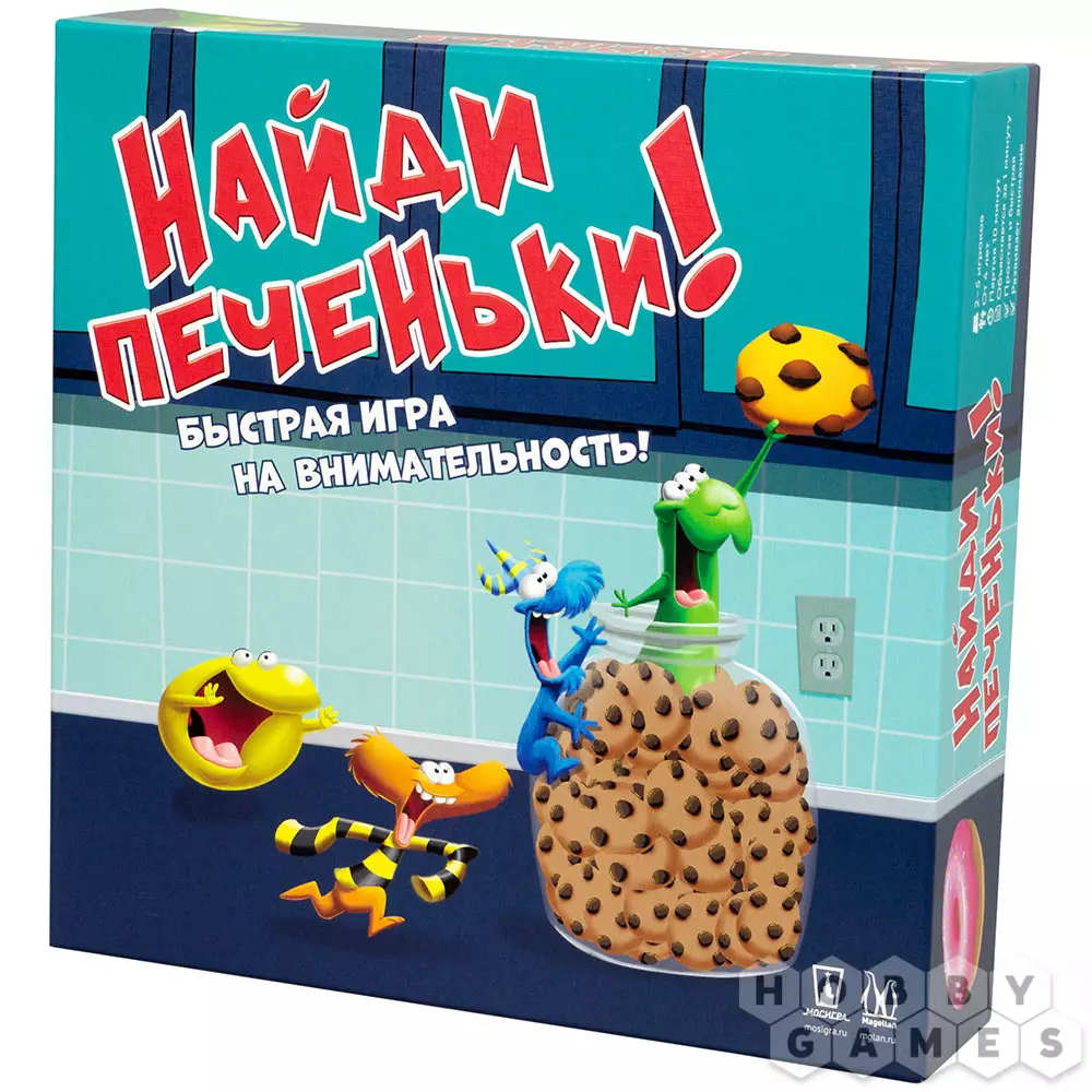 “Найди печеньки!” – быстрая игра на внимательность. В начале каждого хода на столе выкладывается ряд из трёх карт, на которых изображены сладости, между которыми протянут верёвочный лабиринт. Бросок кубика определяет, с изображения какой вкусности необходимо начать игру. Далее нужно по верёвочке отследить путь от первой печеньки первой карты до последней на третьей карте.