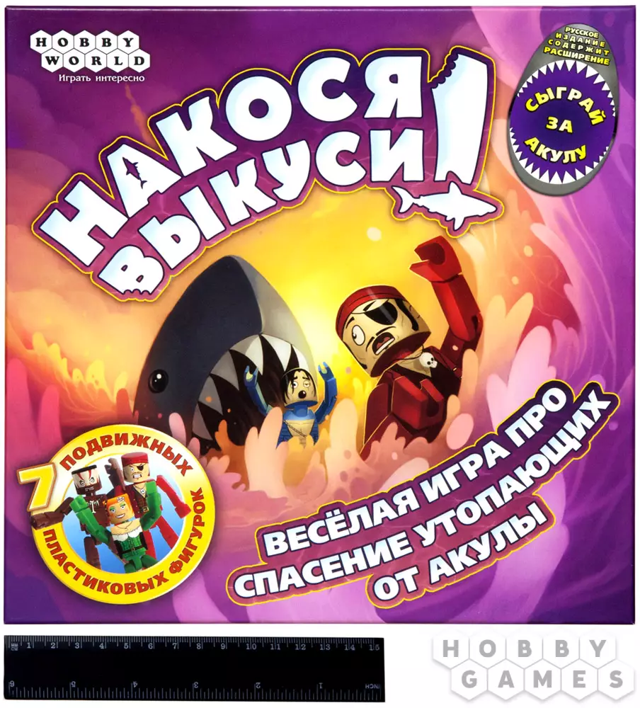 "Накося выкуси" – это быстрая динамичная игра для 2-7 игроков, которая придётся по душе и взрослым и детям. Водный антураж, забавные роботы-пираты и простые правила помогут скоротать время в поездке или разбавить семейный тихий вечер. В коробке вы также найдёте дополнение "Сыграй за акулу", с помощью которого один из игроков может принять сторону зла и стать акулой. Водные просторы ждут вас!