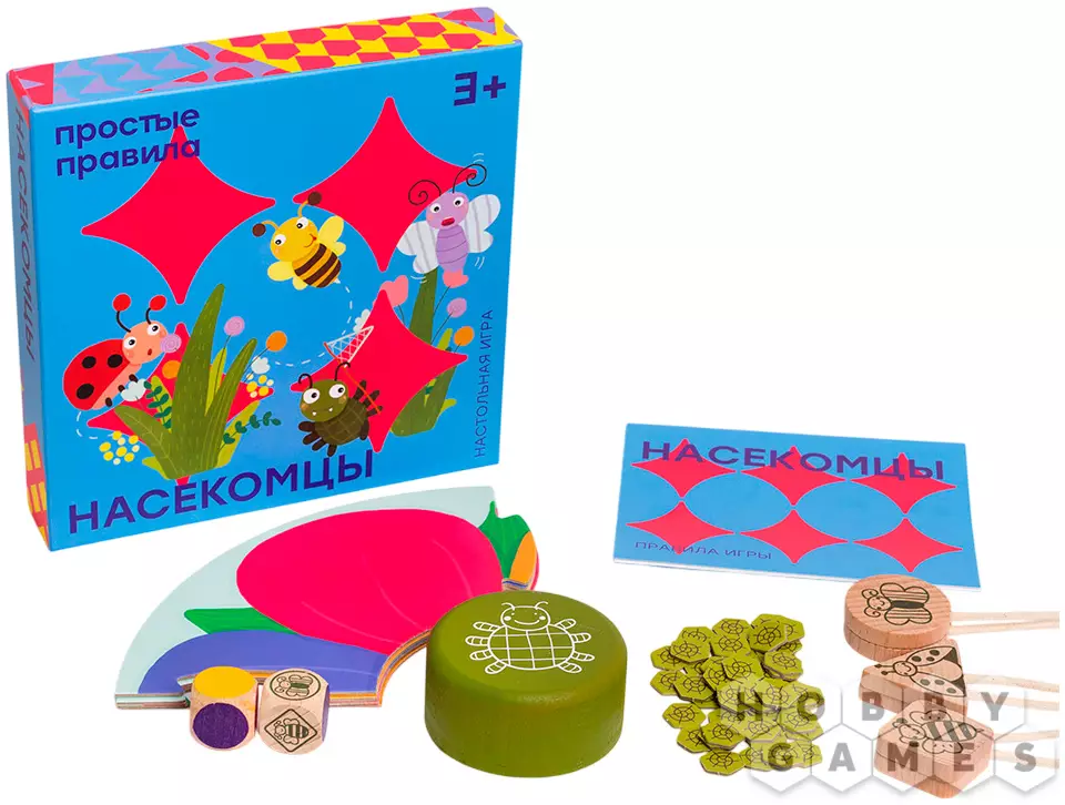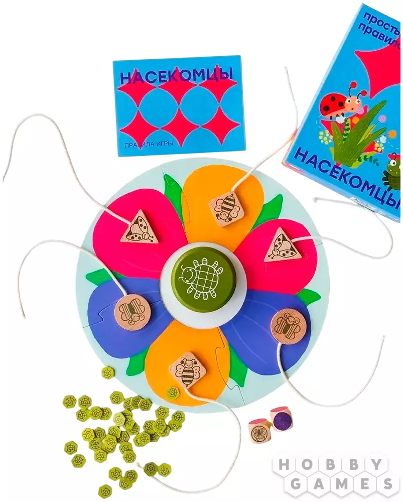 Два кубика указывают на цвета: если на двух кубиках выпал один цвет, то надо ловить жучка на лепестке этого цвета, а если выпали разные цвета, то надо целиться в цвет, который не выпал на кубиках. Второй специальный кубик указывает на тип насекомца, которого нужно поймать.