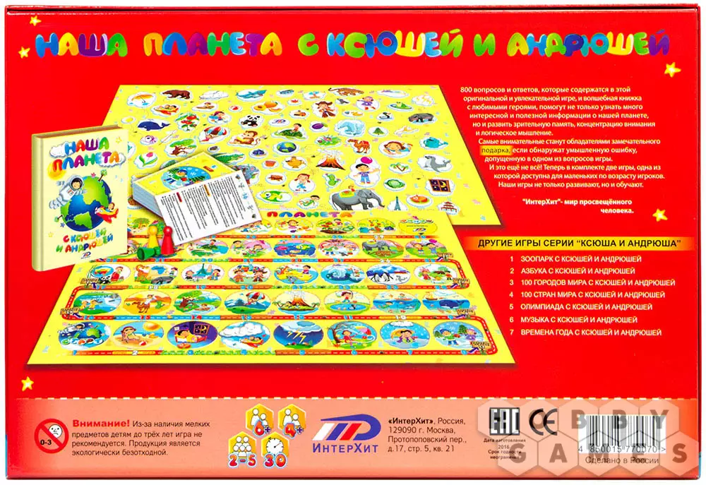 Для игры "Наша планета" Ксюша и Андрюша собрали 800 самых интересных вопросов о Земле. Проверьте себя, что Вам известно о континентах и странах, о климате и катаклизмах, о природе, флоре и фауне? Отвечайте на каверзные вопросы и ищите подсказки на игровом поле и карточках с заданиями!