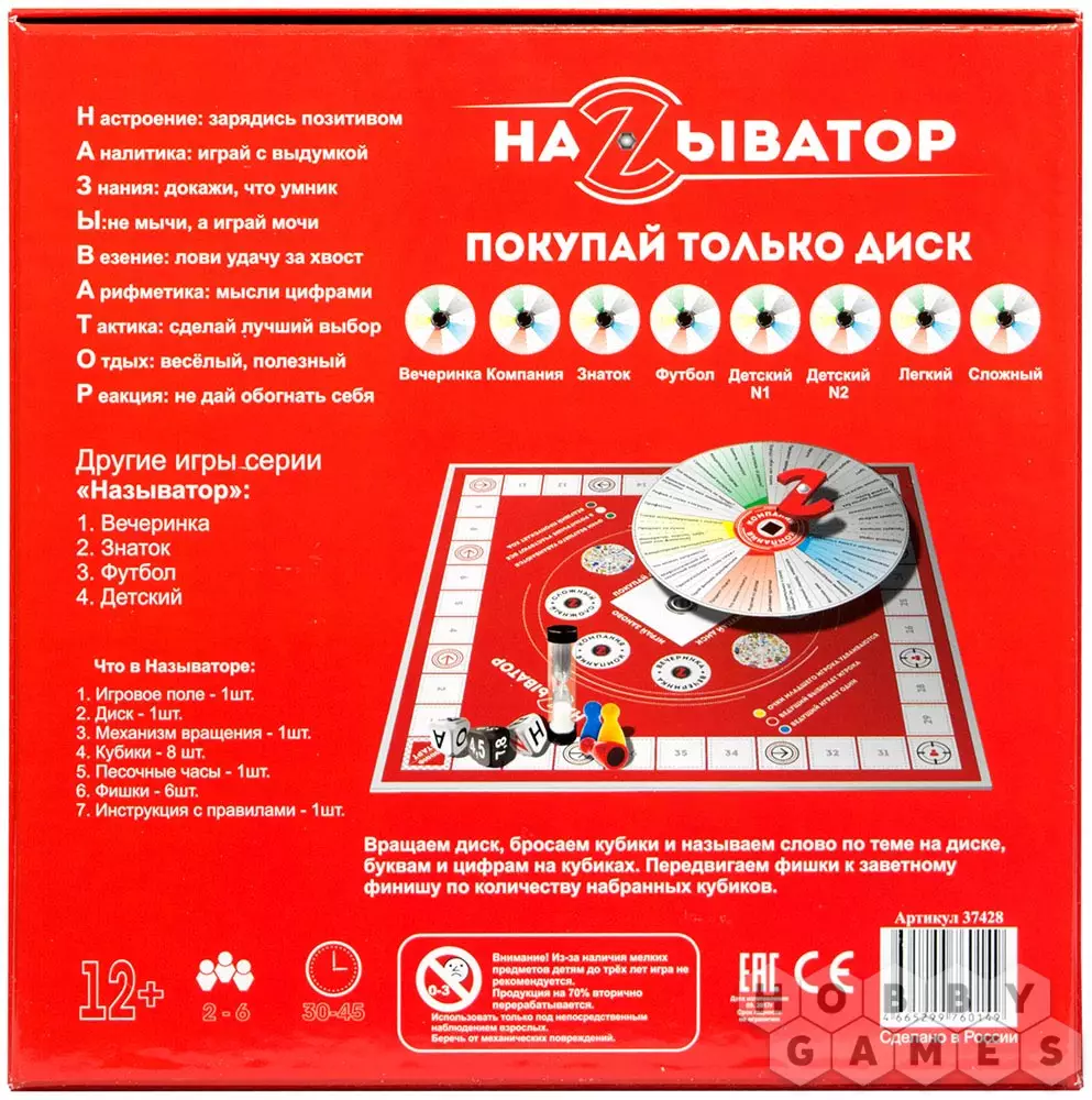 Настольная игра "Называтор" обеспечит Вашу вечеринку весёлым и шумным времяпрепровождением. Бросаем кубики, крутим двухсторонний диск с вопросами и включаем находчивость и сообразительность на полную катушку, стремясь опередить соперников. Вопросы будут попадаться самые обычные, понятные всем, но, несмотря на это, далеко не каждый сможет вот так, сходу придумать нужное слово, учитывая выпавшие буквы на кубиках. Назовите, например, "изделие из дерева", начинающееся на определённую букву, или же конкретной длины! После недолгих раздумий слово всё-таки нашлось, но, увы, кто-то забрал кубик с нужной буквой. Значит, придётся подбирать новый ответ, учитывая, что сложность раунда повышается с каждым названным словом.
