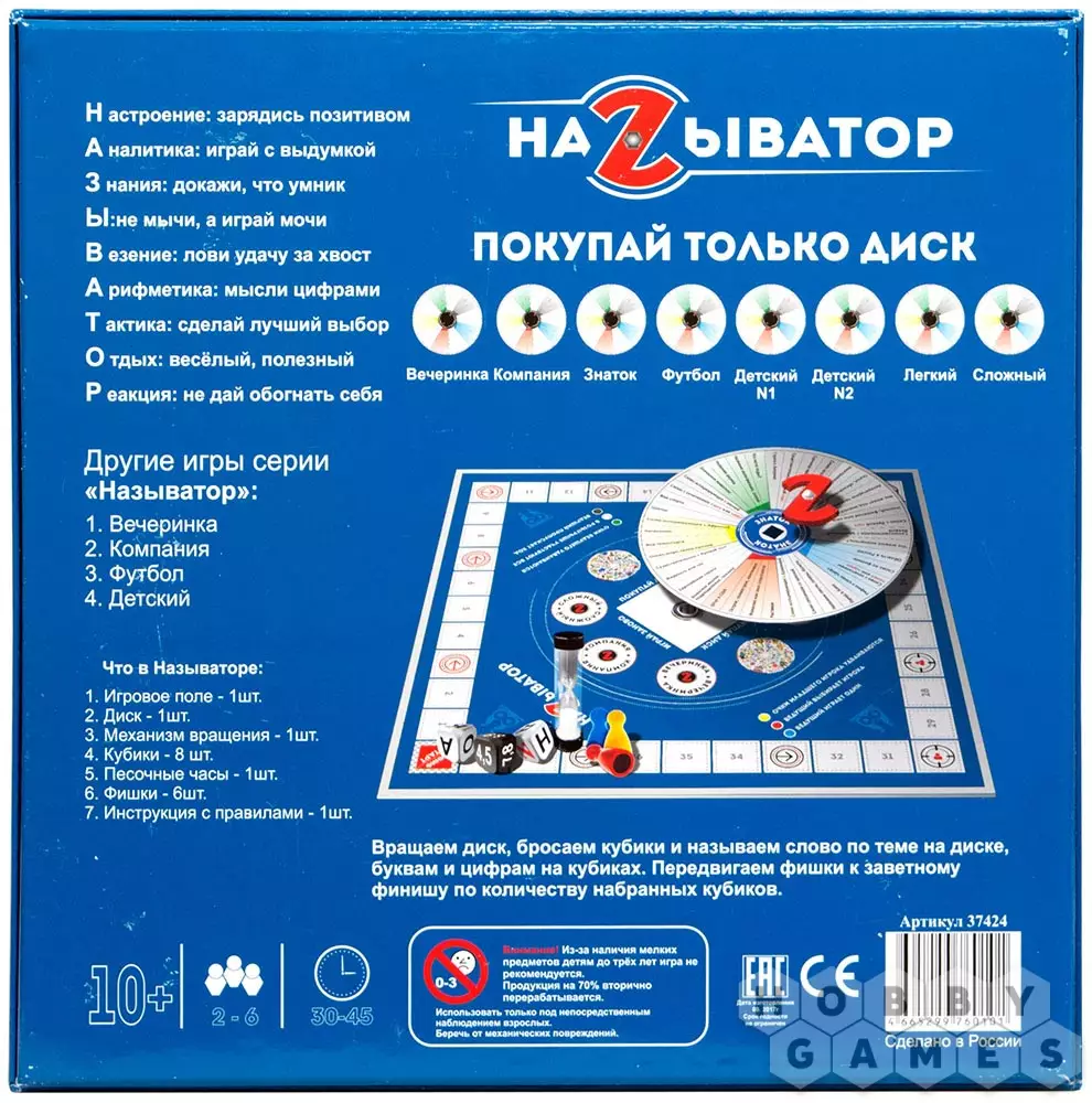 Настольная игра "Называтор" обеспечит Вашу вечеринку весёлым и шумным времяпрепровождением. Бросаем кубики, крутим двухсторонний диск с вопросами и включаем находчивость и сообразительность на полную катушку, стремясь опередить соперников. Вопросы будут попадаться самые обычные, понятные всем, но, несмотря на это, далеко не каждый сможет вот так, сходу придумать нужное слово, учитывая выпавшие буквы на кубиках. Назовите, например, "слово из математики", начинающееся на определённую букву, или же конкретной длины! После недолгих раздумий слово всё-таки нашлось, но, увы, кто-то забрал кубик с нужной буквой. Значит, придётся подбирать новый ответ, учитывая, что сложность раунда повышается с каждым названным словом.
