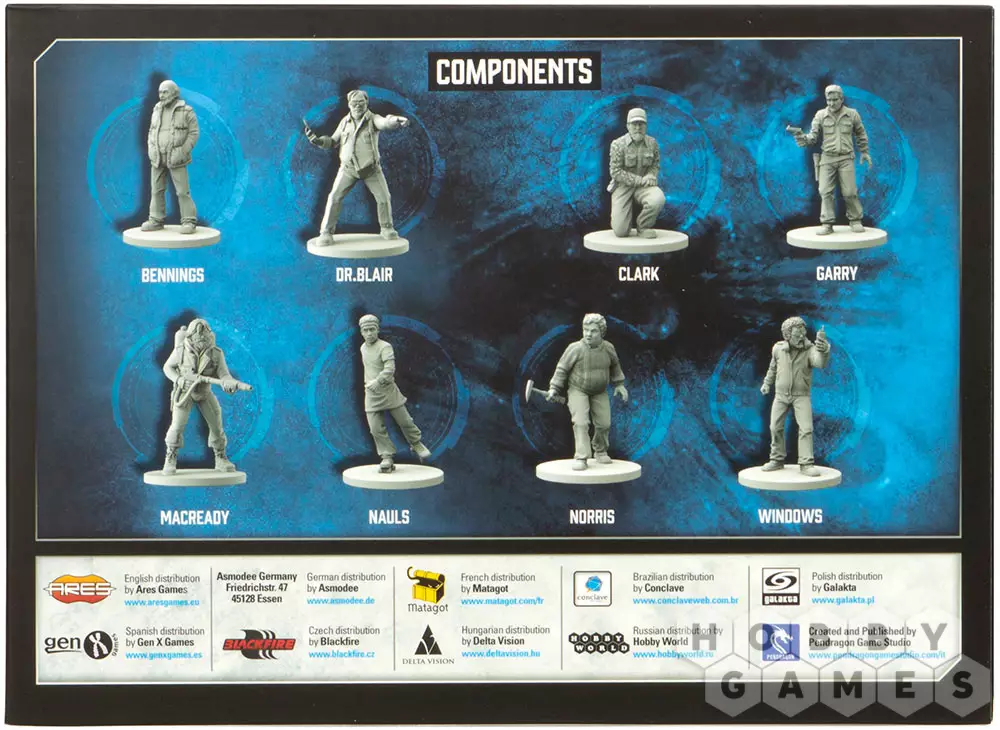 Комплект состоит из двух наборов миниатюр для игры "Нечто" – Human Miniatures Set и Alien Miniatures Set. В первом вы найдёте восемь высокодетализированных пластиковых миниатюр персонажей, которыми сможете заменить фишки персонажей. Миниатюры созданы на основе классических образов из фильма и изображают главных героев игры, например, Макреди и доктора Блэра. Второй набор, с пришельцами, состоит из четырёх моделей, каждая из которых – одна из стадий развития Нечто. Используйте миниатюры из этих наборов, чтобы ваши игры стали ещё красивее и интереснее.