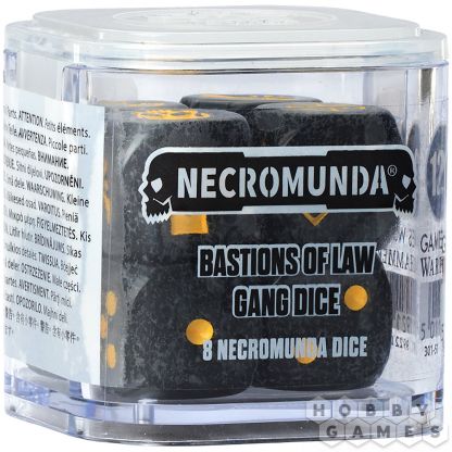 Набор Bastions of Law – это комплект из восьми шестигранных кубиков с закруглёнными углами, посвящённых бандам паланитов-наёмников. Кубики выполнены из перламутрового чёрного акрила и отмечены жёлтой краской. Грани с номерами от 1 до 5 обозначены традиционными точками, а грань с числом 6 украшена строгой эмблемой Паланитских стражей.