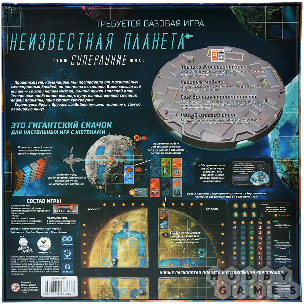Перед вами "Суперлуние" – дополнение к стратегической игре "Неизвестная планета". Оно вносит три новых модуля в базовую игру, которые можно комбинировать по своему вкусу. Модуль "Суперлуние" добавляет специальные планшеты лунных баз, за освоение которых вы получите дополнительные очки. А "Аварийные жетоны" и "Массивы" привнесут новые жетоны в игру и предложат новые стратегические возможности. Искушённым игроками придутся по вкусу асимметричные планшеты расколотой планеты и разделённой корпорации, требующие совершенно нового подхода. Дополнение также включает новые карты событий и освоения, которые разнообразят привычные механики. Подходит для тех, кто хочет испытать себя и ищет новые способы взаимодействия с полюбившейся игровой системой. Попробуйте удержать контроль над планетой в новых условиях – и не забудьте, что победителем станет тот, кому удастся создать самую многообещающую колонию на космических просторах!