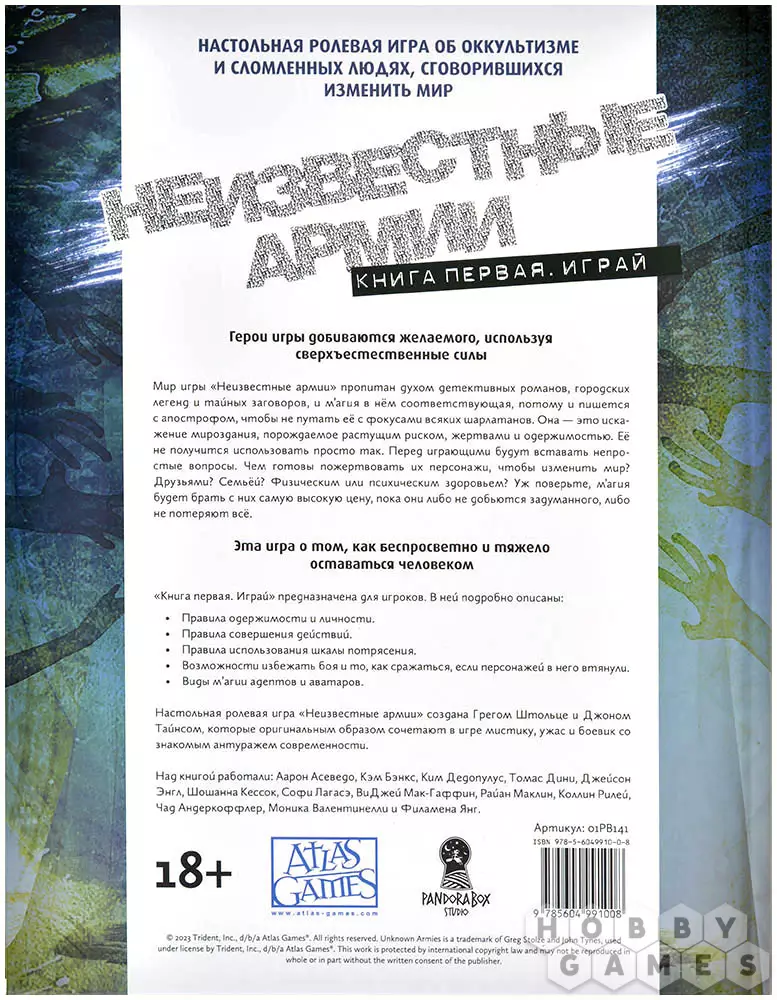 Под обложкой "Книги 1: Играй" вы найдёте всё, что вам надо знать об устройстве системы и мире НРИ "Неизвестные Армии". Она будет полезна не только в качестве книги игрока, но и для ведущего игры, поскольку содержит в себе все основные правила.