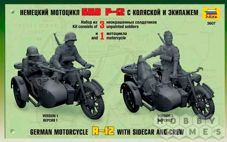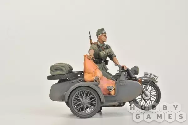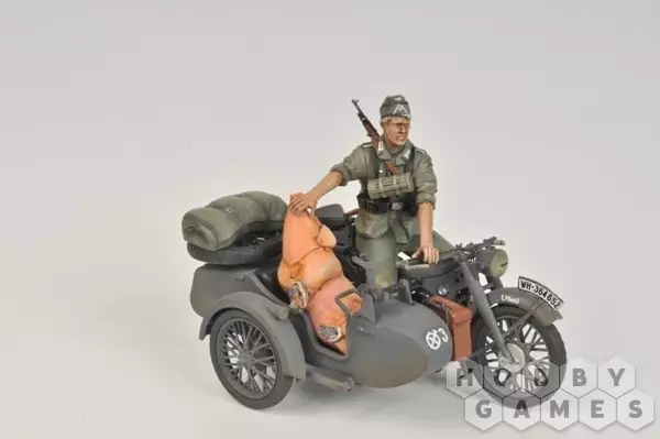 Набор включает 3 фигурки солдат и миниатюру BMW R-12, что позволяет воссоздать различные военные действия.
