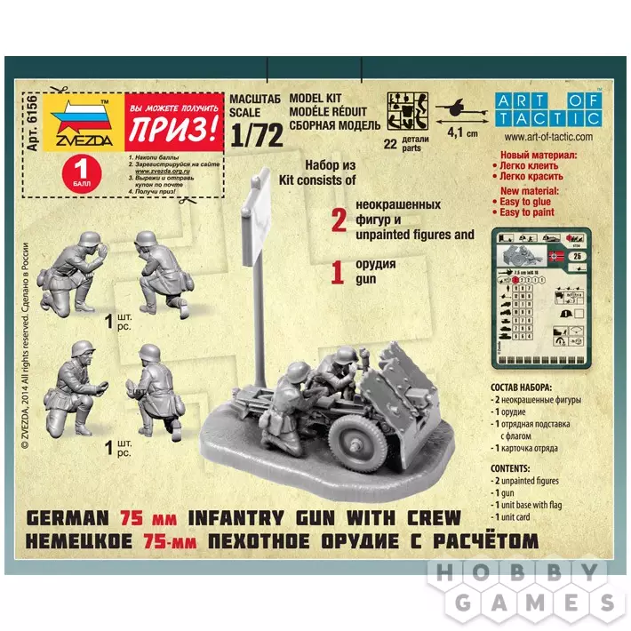 Вы можете использовать миниатюры из этого набора в игровой системе Art of Tactic. Это орудие является мощным инструментом для уничтожения пехотных подразделений и танков противника, особенно эффективно при стрельбе из засад и в обороне. Однако требует грамотного размещения из-за ограниченного сектора стрельбы и медленного развёртывания.