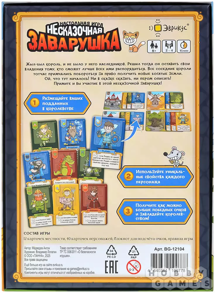 "Несказочная заварушка" – это динамичная карточная игра, где вам предстоит сразиться за право стать новым правителем сказочного королевства. Расставляйте персонажей на картах лесов, замков и деревень, используйте их способности и перехитрите соперников, чтобы собрать как можно больше очков. Простые правила, яркие иллюстрации и непредсказуемые повороты делают каждую партию уникальной. Идеально для тех, кто любит быстрые, но насыщенные игры с элементами стратегии и юмора.