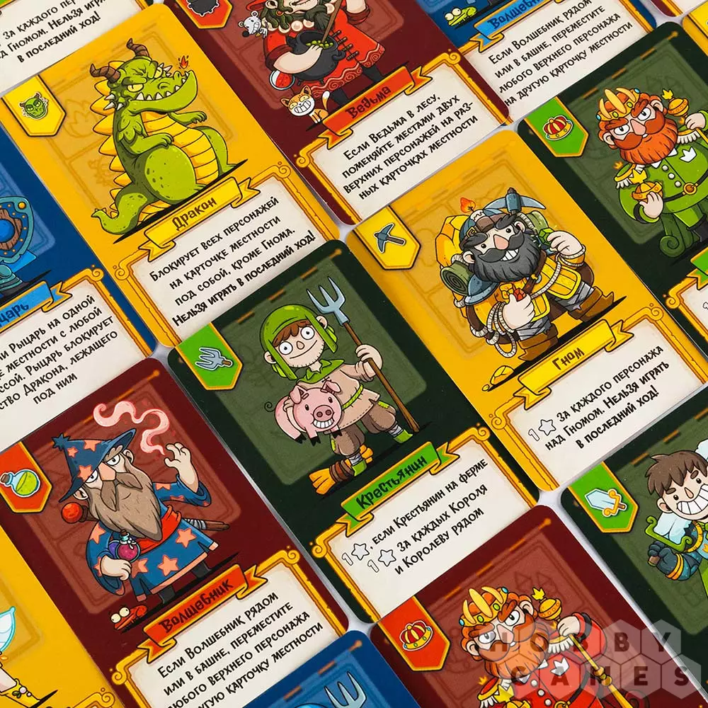 В игре два типа персонажей: одни приносят победу за правильное размещение, другие позволяют менять правила на лету – например, перемещать фигуры или срывать планы врагов. Всего шесть ходов – но за это время разворачивается настоящая битва за влияние! В конце подсчитываются очки, и тот, кто набрал больше всех, объявляется новым королём.