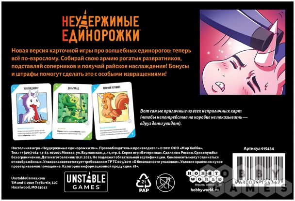 "Неудержимые единорожки" – это весёлая карточная игра, которая украсит собой любую вечеринку. И ещё бы, ведь рецепт этой настолки невероятно прост и изыскан: милые единороги и поразительные разрушения! Игра начинается с малыша-пони, и даже не думайте привязываться к этому очаровательному созданию – вряд ли оно выживет. Этот мир магии и блёсток жесток...