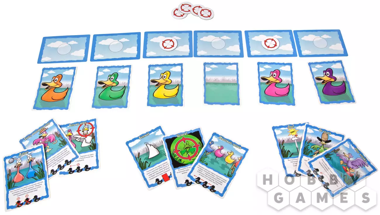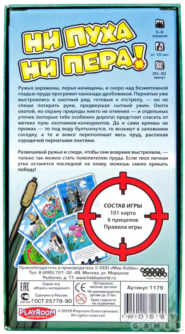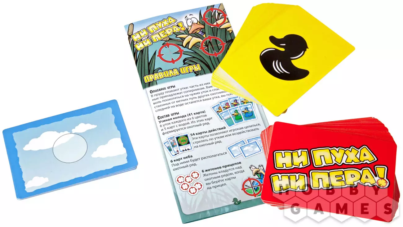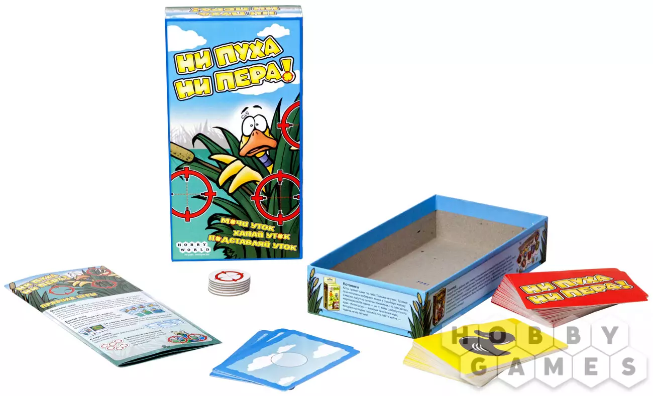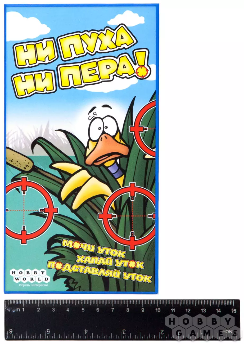 «Ни пуха ни пера» — карточная игра для 3-6 участников возрастом от 10 лет. Скоро над безмятежной гладью пруда прогремит канонада дробовиков. Пернатые уже выстроились в охотный ряд, готовые к отстрелу, — но не спешите потирать руки, предвкушая сытный ужин. Охота охотой, но охрану природы никто не отменял — и отдельных уточек (которые вам особенно дороги) предстоит спасать от метких пуль охотников-конкурентов. Да и сами кряквы не промах — то под воду бултыхнутся, то возьмут в заложники соседку, а то и вовсе переполошат весь пруд, распихав сородичей пернатыми локтями.
