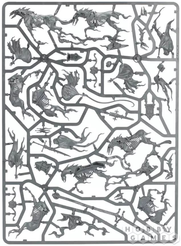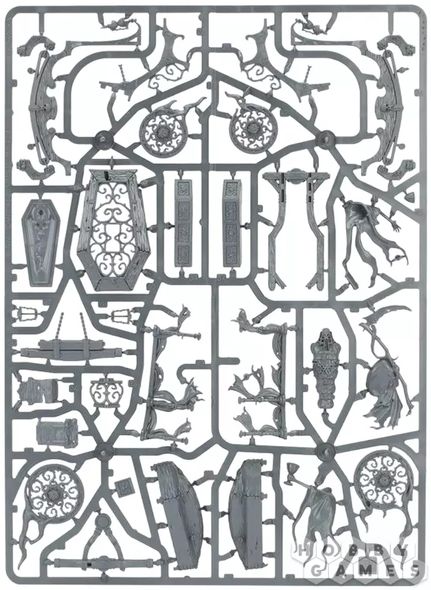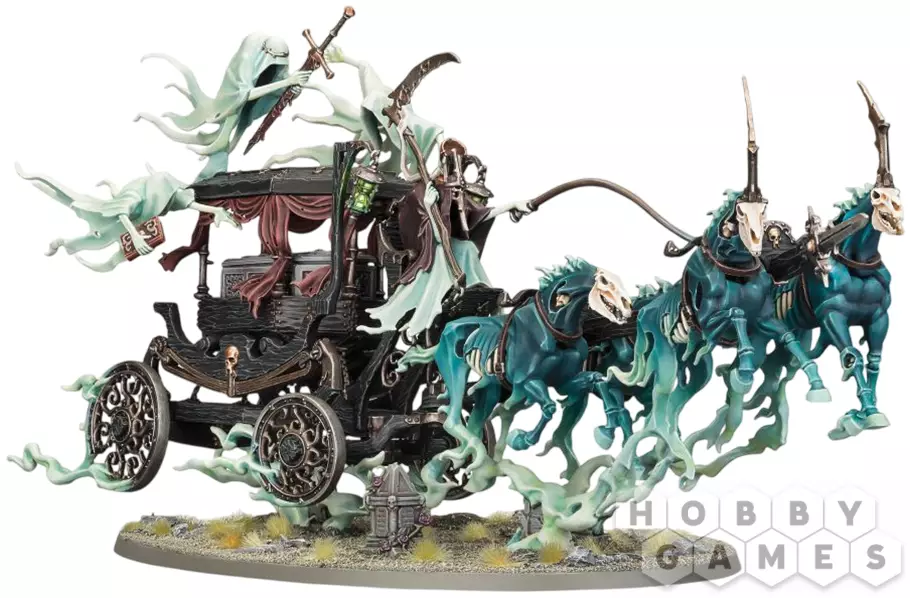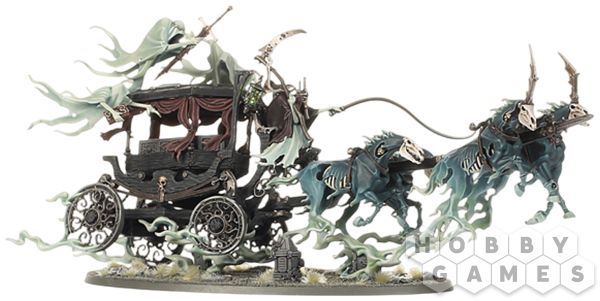 В набор входит всё необходимое для сборки Black Coach. Это катафалк, сделанный из тяжёлых иконных досок, сколоченных вместе, но едва сдерживающих заточённые внутри призрачные силы, а занавески в нём собраны и привязаны к доскам, отчего взгляду наблюдателя предстаёт жуткий гроб. В нём покоится скованный цепями вампир, что можно увидеть, если вы решите собрать гроб без крышки. И два меньших передних колеса, и два больших задних сделаны из покрытого резьбой железа. То тут, то там можно увидеть символы смерти – черепа и песочные часы. Вокруг экипажа кружат три хранителя реликвий (Relic Bearers), несущих меч, книгу и чашу, некогда принадлежавшие погребённому вампиру. Направляет катафалк могильный призрак, на которого Вы можете надеть капюшон или корону, а в качестве оружия выдать душехват (soulreach grasp), косу жнеца (reaper scythe) или же не дать ничего, изобразив его размахивающим пустыми руками. Вперёд чёрный экипаж тянут четыре кошмара, летящие на жгутах призрачных энергий, и головы двух передних увенчаны шипами огромных похоронных плюмажей.