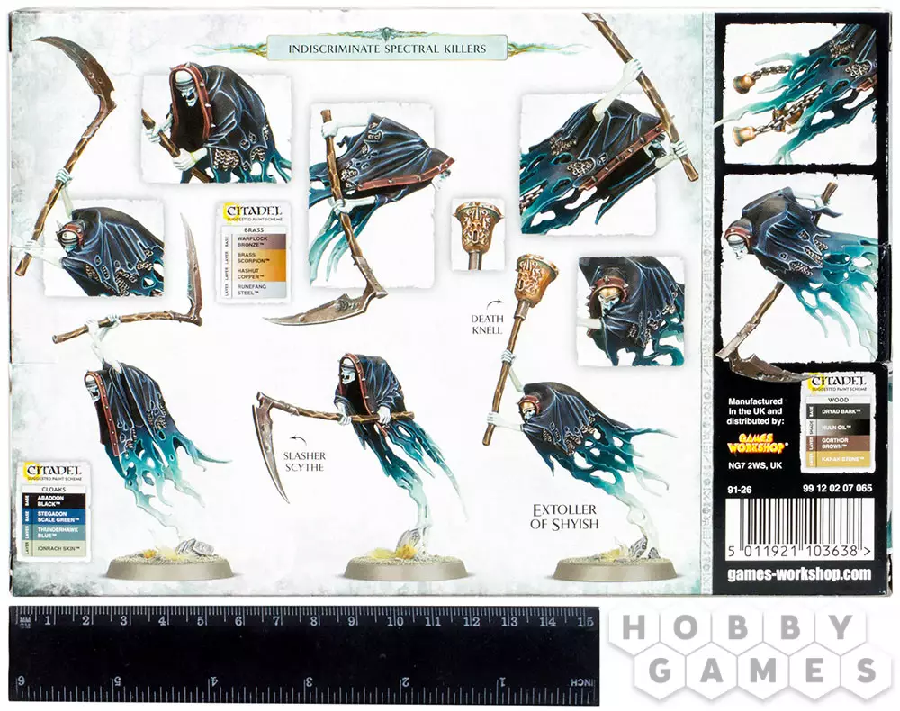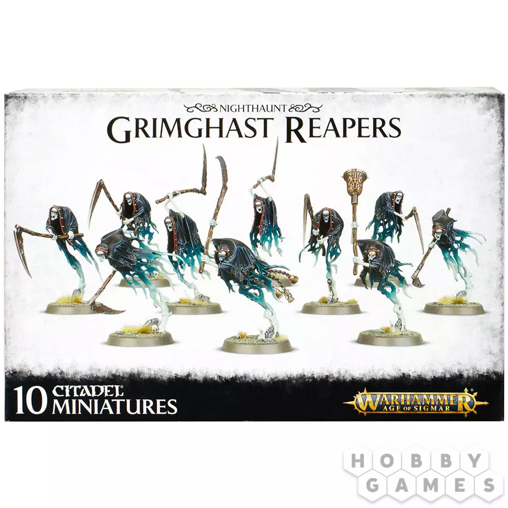 Этот многокомпонентный пластиковый набор содержит детали, необходимые для сборки 10 Мрачных Жнецов (Grimghast Reapers). Эти призрачные убийцы являют собой лишь сгустки эфира, чьи спектральные формы укутаны в ветхие робы. Их изможденные лица закрывают куски освященного савана, полностью лишая их зрения, эфирного и физического – это проклятие удерживает их в вечной ярости. Каждый из жнецов вооружен острой режущей косой и изображен в замахе, а также есть вариант сборки одной миниатюры в качестве Звонаря Шаиша (Extoller of Shyish), лидера отряда. Он вооружен колоколом смерти (представлен в 2-х вариантах), чей смертный звон восхваляет Верховного Лорда Нежити (Supreme Lord of the Undead). Каждая миниатюра соединяется с подставкой с помощью жутких надгробных камней, из которых и воплощаются жнецы.