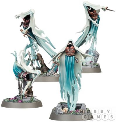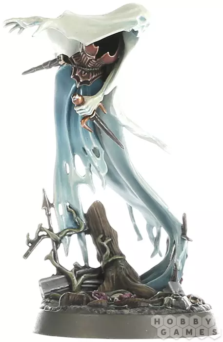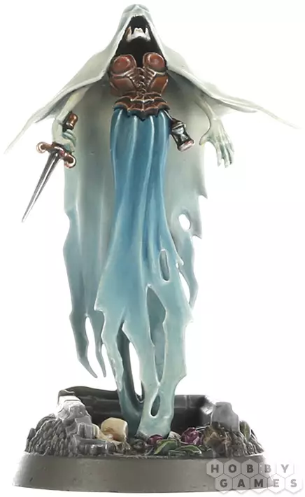 Myrmourn Banshees испытывают вечный голод, ведь по-настоящему насытиться они могут только от магической энергии. Они скитаются во Владениях Смертных в поисках заветной силы, и ни один колдун не будет в безопасности от вечного преследования этих жутких призраков. Банши тянутся к магии, словно гниль к мертвому телу, и такова участь, уготованная ими каждому смертному на их пути, – быстрый удар холодного проклятого кинжала в сердце. Сами зловещие банши не имеют тел – лишь развевающиеся саваны, пустые доспехи, окутанные эфирным свечением, и черепа с широко раскрытыми ртами, заходящиеся в крике и плаче. Они парят над землей, сжимая в призрачных руках свои проклятые кинжалы.
