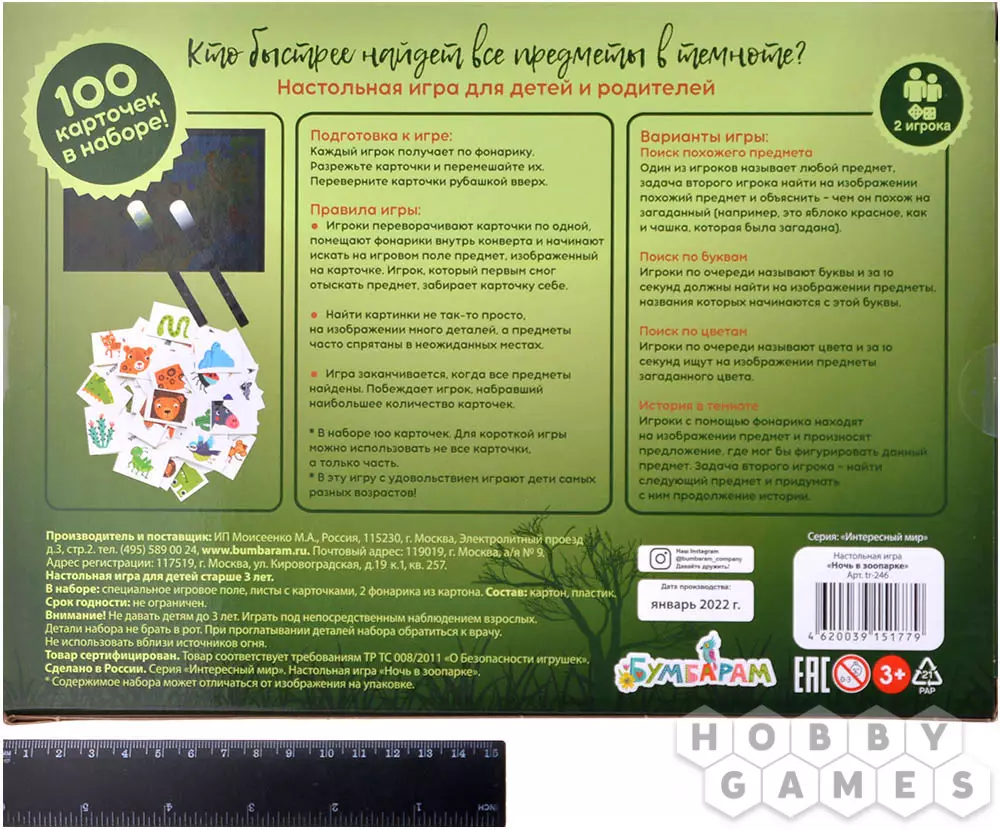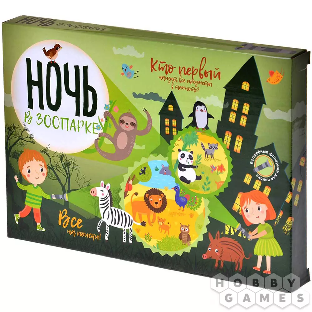 "Ночь в зоопарке" – это простая детская игра на внимательность для самых юных сыщиков. Игрокам с помощью волшебных фонариков предстоит искать в темноте предмет, изображённый на карточке. Для этого нужно опустить волшебный фонарик в конверт и постараться найти нужное изображение на игровом поле. В комплекте целых 100 карточек, но для короткой игры можно использовать и меньше. А ещё есть несколько вариантов игры: "поиск похожего предмета", "поиск по буквам", "поиск по цветам" и "история в темноте".