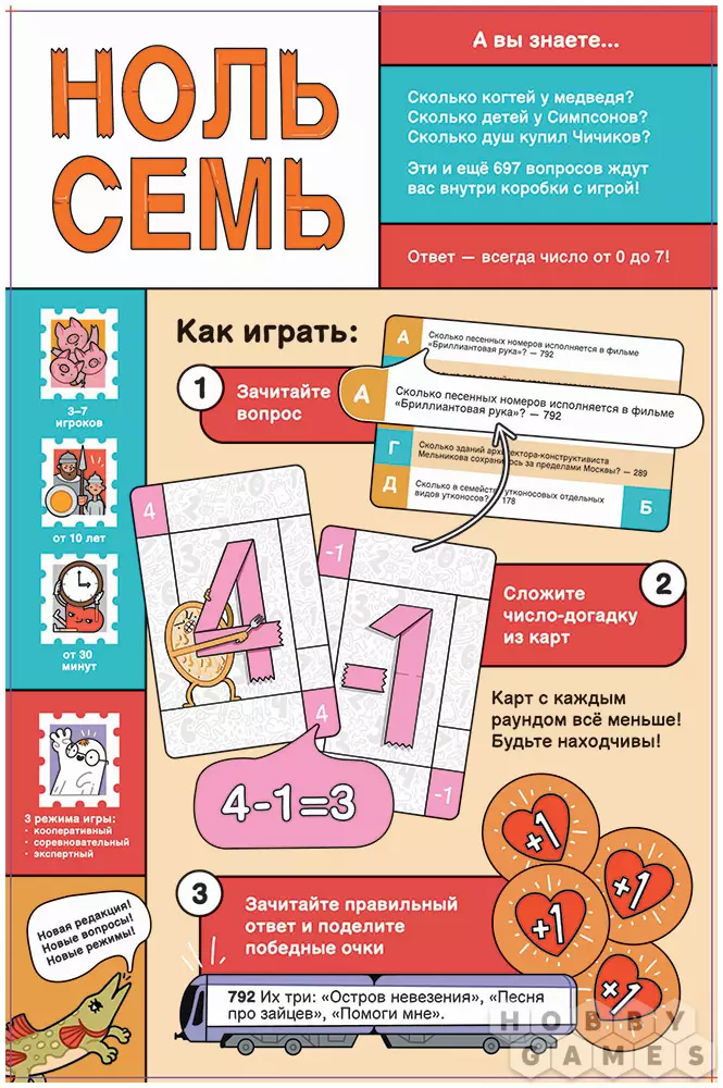 "Ноль семь" – быстрая настольная викторина, где все ответы находятся в диапазоне от 0 до 7. Вам предстоит отвечать на необычные, забавные и познавательные вопросы из самых разных областей – от истории и литературы до поп-культуры и повседневной жизни. Это прекрасный вариант развлечения для семейного вечера или небольшой вечеринки друзей, которым просто хочется весело, но с пользой провести время. А польза гарантирована – ведь вы не только разомнёте мозги, но и узнаете много новых фактов! Простые правила позволяют начать играть уже через пару минут, а сотни вопросов делают каждую партию непредсказуемой.