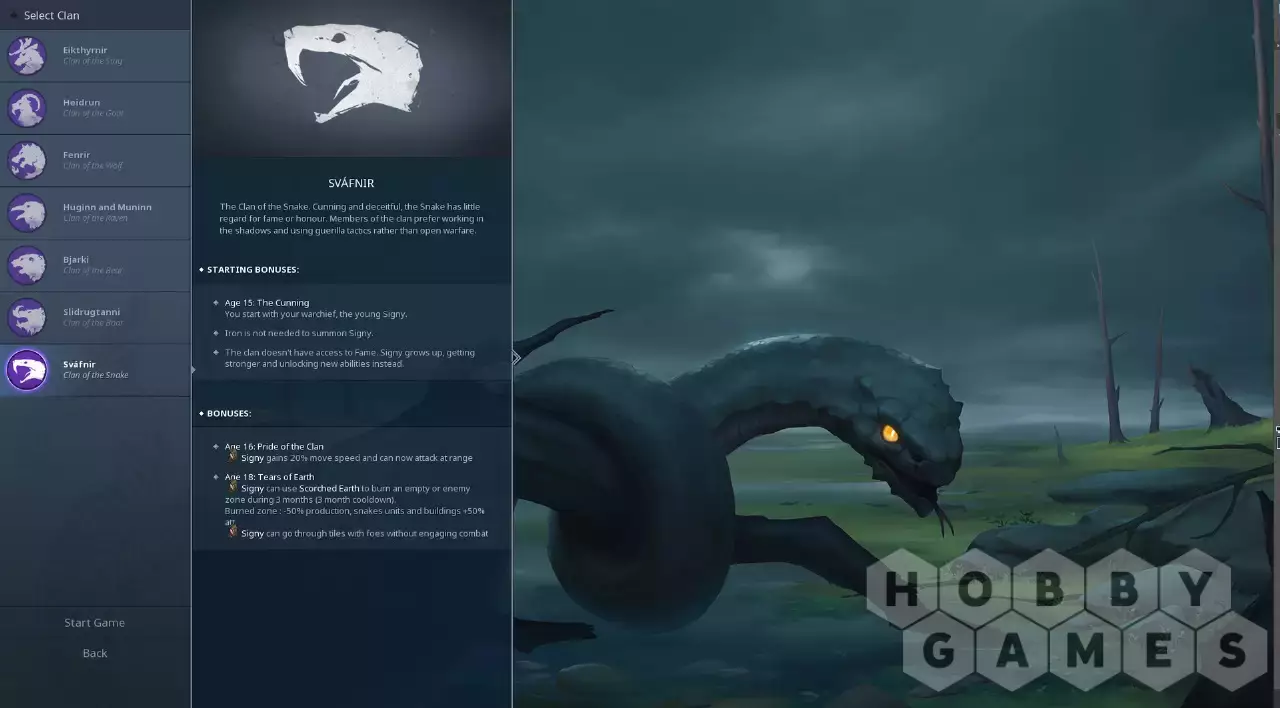 The Clan of the Snake, gathers some of the most roguish vikings to set foot on the continent of Northgard. Led by Signy, the Spear Maiden, the cunning members of the clan have little regard for fame or honour and would rather use guerilla tactics to dominate their enemies than open warfare.