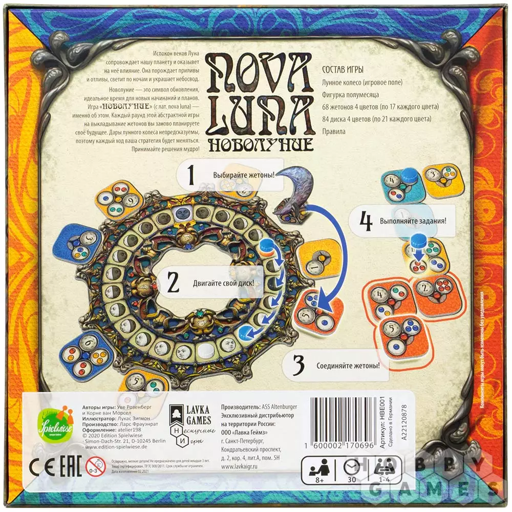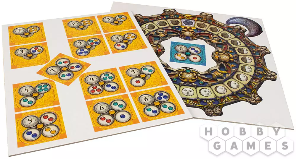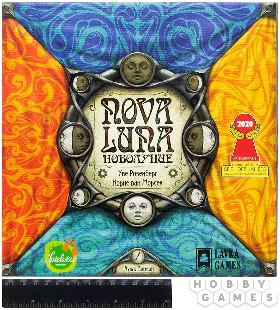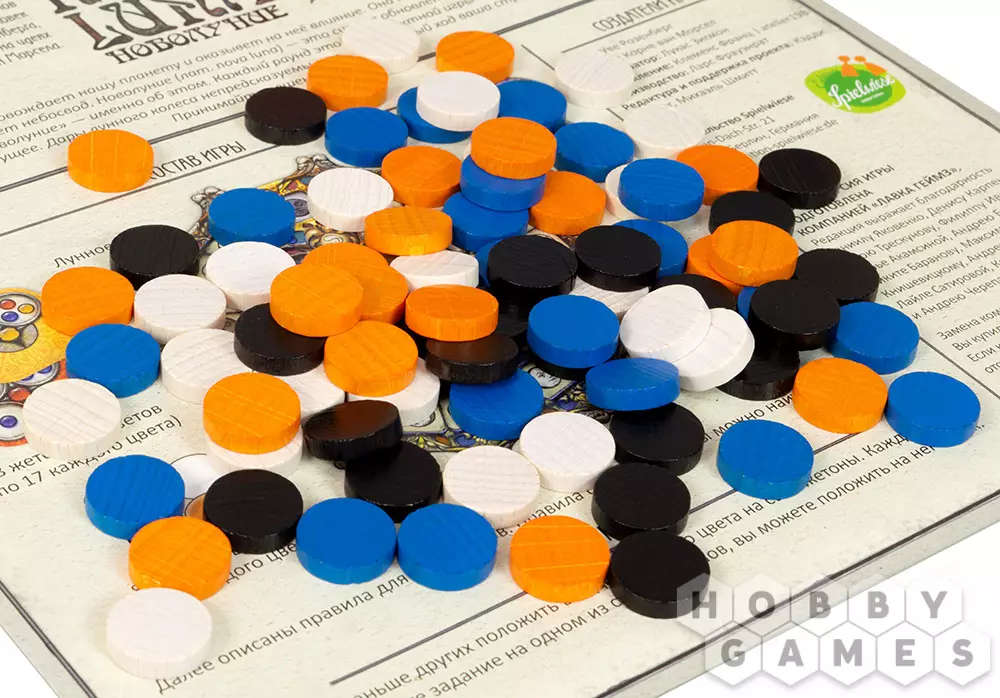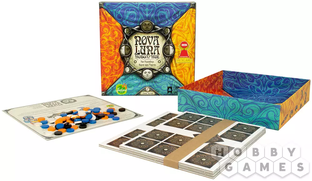 "Новолуние" – красочная абстрактная игра, в которую можно играть как одному, так и в компании. В игре есть игровое поле в виде лунного колеса, жетоны с заданиями и деревянные диски. Жетоны и диски в игре четырёх цветов: жёлтого, синего, красного и бирюзового. На жетонах изображены задания и цифры. Цифры – количество сегментов на колесе, на которое вы должны передвинуть диск своего цвета. Когда вы выполняете задания на жетонах, на них вы также располагаете диски из своего запаса. Чтобы выполнить задания, нужно располагать жетоны по соседству в соответствии с цветами, указанными в заданиях. Тот, кто первым выложит последний диск из своего запаса на жетон – побеждает.