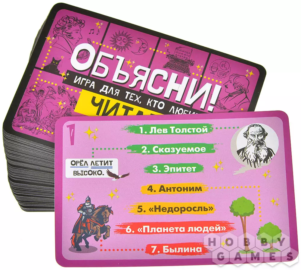 В коробке вас ждут 64 карточки, на которых собраны слова, разделённые на три уровня сложности. Здесь есть всё, чтобы проверить свою литературную эрудицию: важнейшие термины из области литературоведения и лингвистики, названия культовых произведений и фамилии писателей, вошедших в историю.