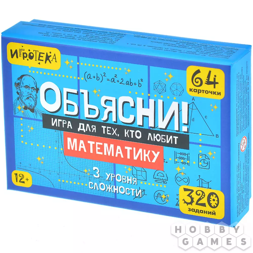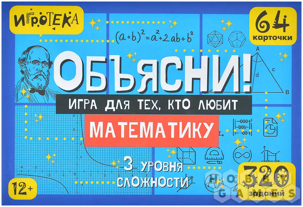 В наборе вас ждут 64 карточки с заданиями, разделёнными на три уровня сложности. Здесь соседствуют имена великих учёных, чьи открытия изменили мир, математические формулы и понятия, а также геометрические фигуры. Теперь объяснить теорему Пифагора или синусоиду можно не у доски, а в весёлой игре с друзьями!