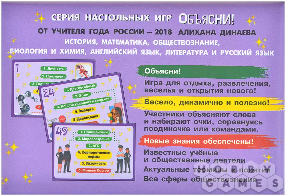 Задача игроков – объяснять друг другу загаданные слова и зарабатывать победные очки. Выбирайте любой формат: играйте каждый сам за себя или объединяйтесь в команды, чтобы сообща разобраться в хитросплетениях социума, политики и экономики.