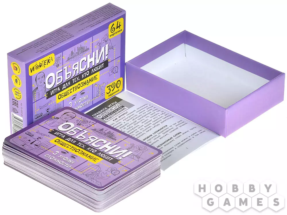 Внутри коробки вас ждут 64 карточки, разделённые на три уровня сложности. Здесь собраны ключевые обществоведческие понятия, актуальные термины, а также имена выдающихся учёных и общественных деятелей, повлиявших на развитие человеческой мысли.