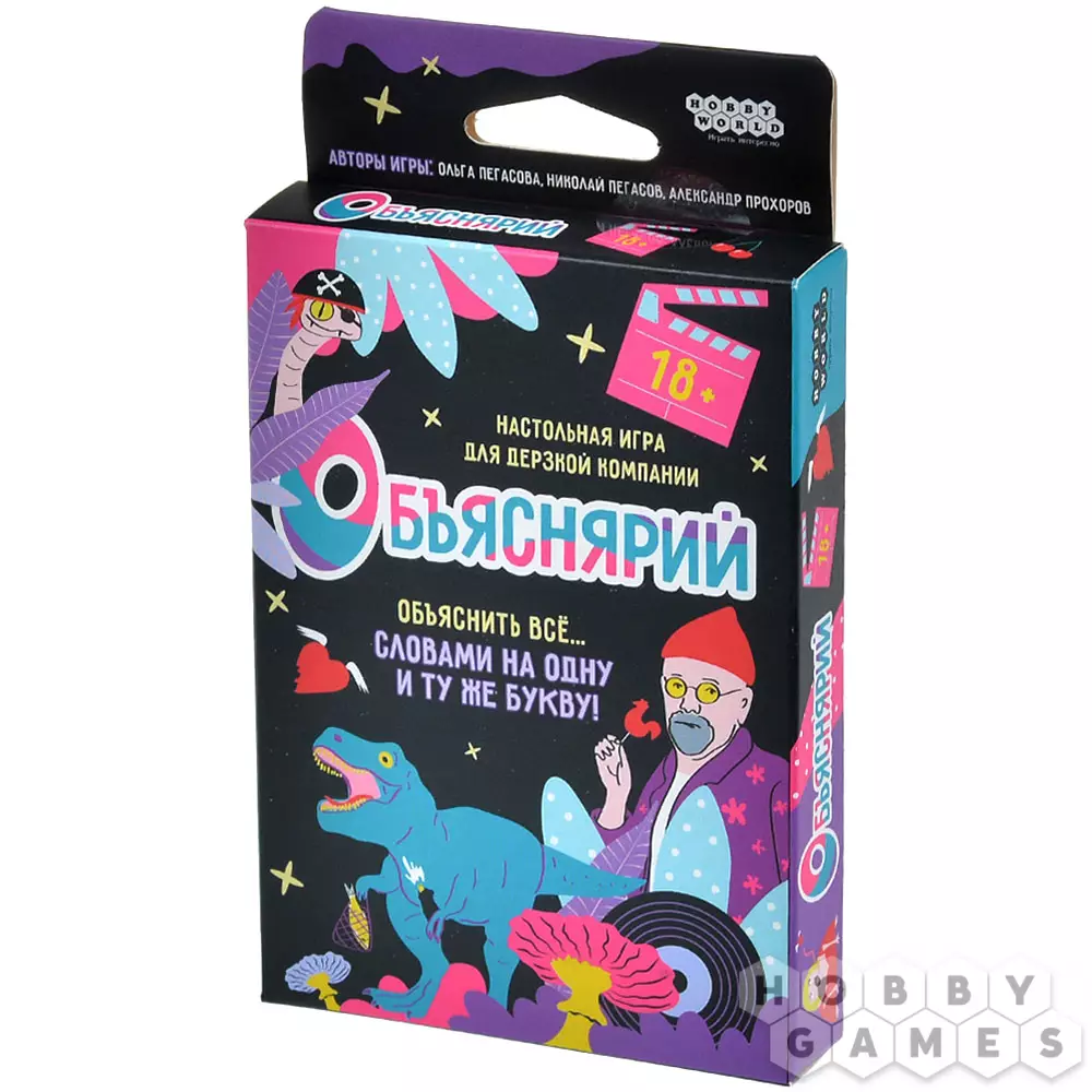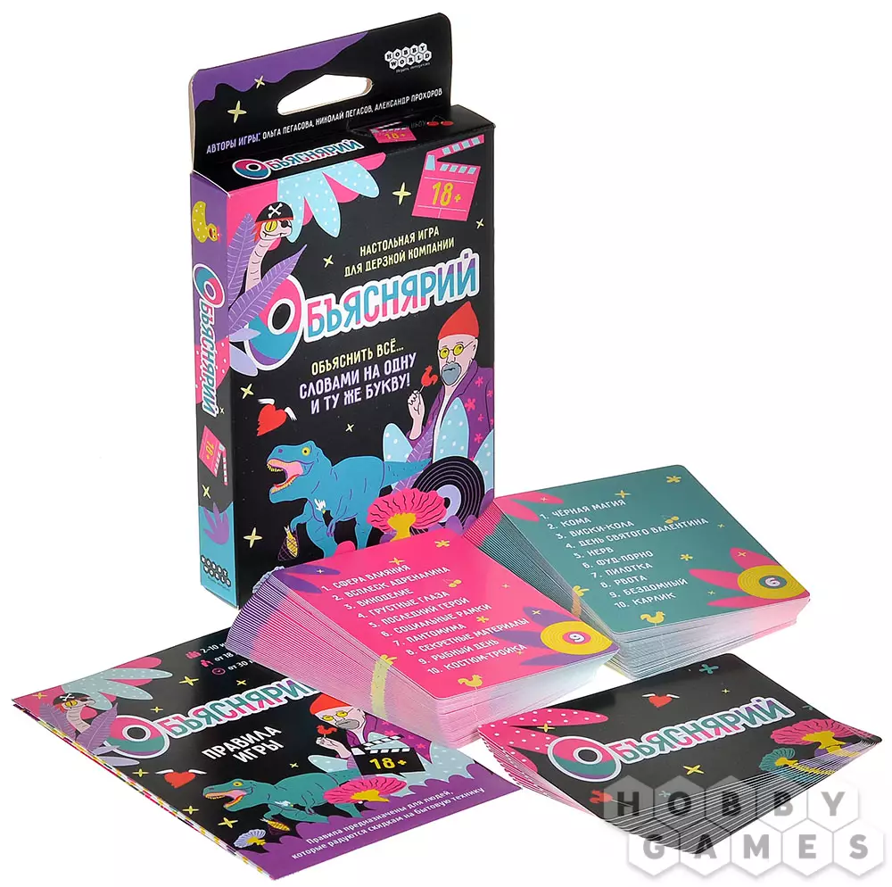 "Объяснярий 18+" – это пикантная карточная игра, которая заставит ваш мозг выложиться не на 100, а на все 200 процентов! Задача игроков предельно проста – всего лишь объяснять слова другими словами. Вот только делать это придётся не абы как: словарь игроков будет ограничен до одной единственной буквы. С этой игрой вы точно освежите и пополните ваш словарный запас.