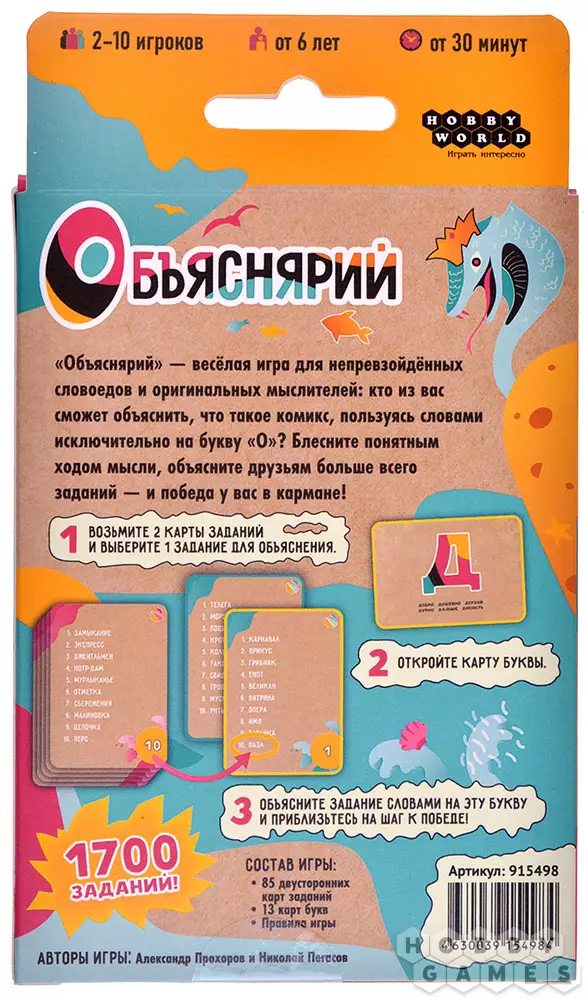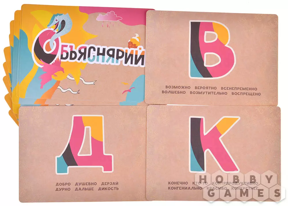 "Объяснярий" – это весёлая карточная игра, которая заставит ваш мозг выложиться на 100 процентов! Задача игроков предельно проста – всего лишь объяснять слова другими словами. Вот только делать это придётся не абы как: словарь игроков будет ограничен до одной единственной буквы. С этой игрой вы точно освежите и пополните ваш словарный запас.