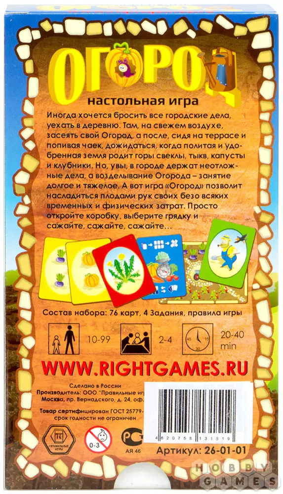 Настольная игра "Огород" – это прекрасная возможность в ненавязчивой и игровой атмосфере объяснить ребёнку, что такое огород и как за ним нужно ухаживать, а совсем маленькие дети подучатся считать и находить соответствия. Взрослым же будет приятно, хоть на несколько минут, покинуть душный город и почувствовать себя на природе. Также эта игра превосходно скрасит долгие, холодные и серые зимние вечера, напомнит про яркое солнце, прохладный ветерок, зелёную траву и свежие овощи!