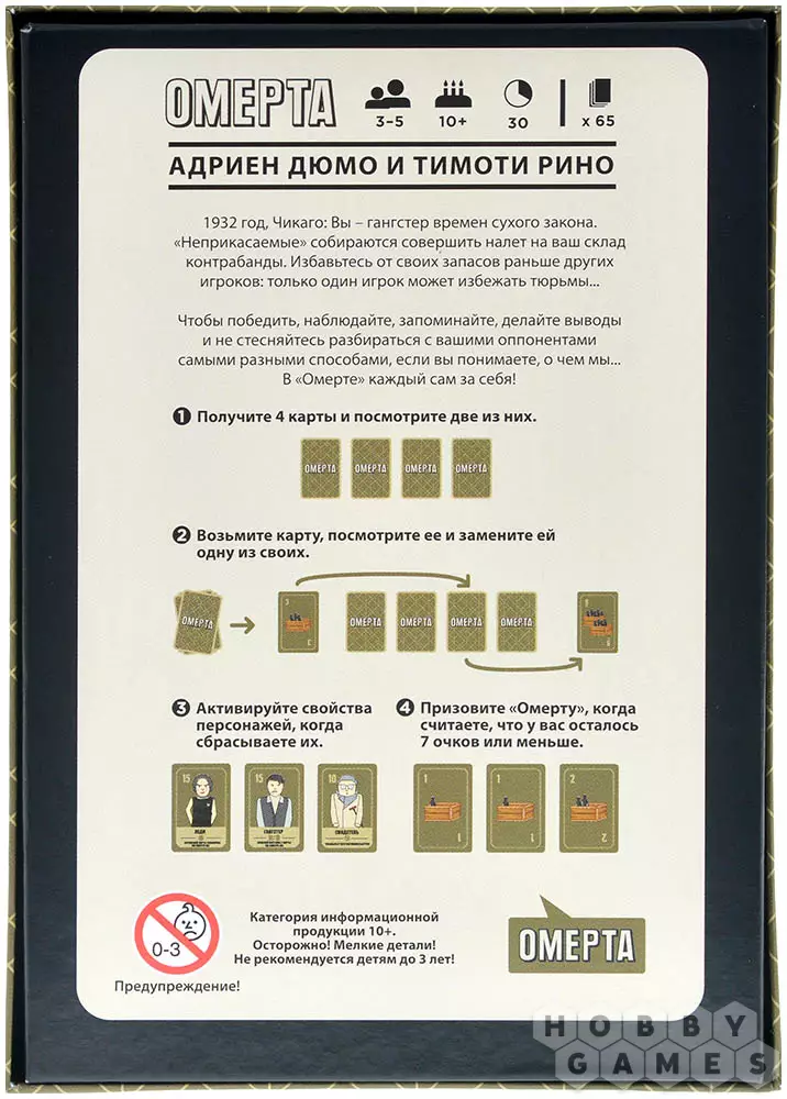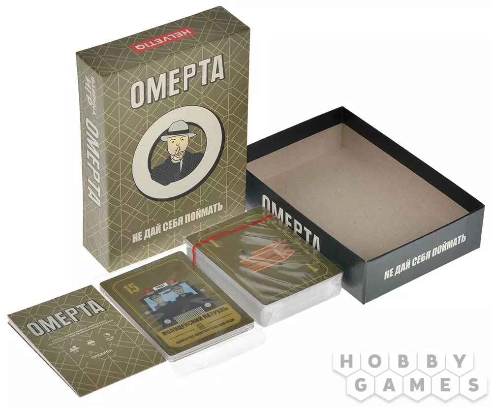 В настольной игре "Омерта" ваша задача – набрать 7 победных очков. Делается это с помощью карт бутылок и помощников. В начале игры вы получаете 4 таких карты, они лежат перед вами лицом вниз, а сложность заключается в том, что вы можете посмотреть только 2 из них в начале игры. В свой ход вы можете взять одну верхнюю карту либо из общей колоды, либо из стопки сброса, посмотреть её, а затем либо отправить в сброс, либо заменить ею одну из своих четырёх карт. Вот только просматривать свои карты при этом нельзя, старайтесь запомнить, что уже обменяли в прошлом раунде, а какие подсмотрели в начале. Как только вы посчитаете, что у вас 7 очков или меньше, призовите остальных игроков к "Омерте" (так называется круговая порука). Раунд немедленно заканчивается, и игроки раскрывают свои карты.