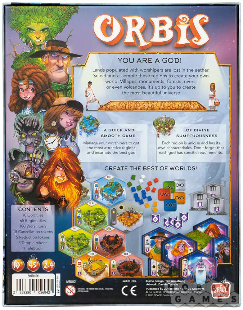 Orbis – тактическая игра о мировом развитии и стратегическом управлении ресурсами, в которой игроки берут на себя роли богов, создающих свои лучшие вселенные. Используя земли, затерянные в пространстве, называемом "эфир", игроки накапливают прихожан (богопоклонников), чтобы тратить их на еще более плодородные земли, некоторые из которых дают бонусы, меняющие правила игры. Ключ к победе заключается в том, чтобы набрать наибольшее количество очков создания в конце игры!