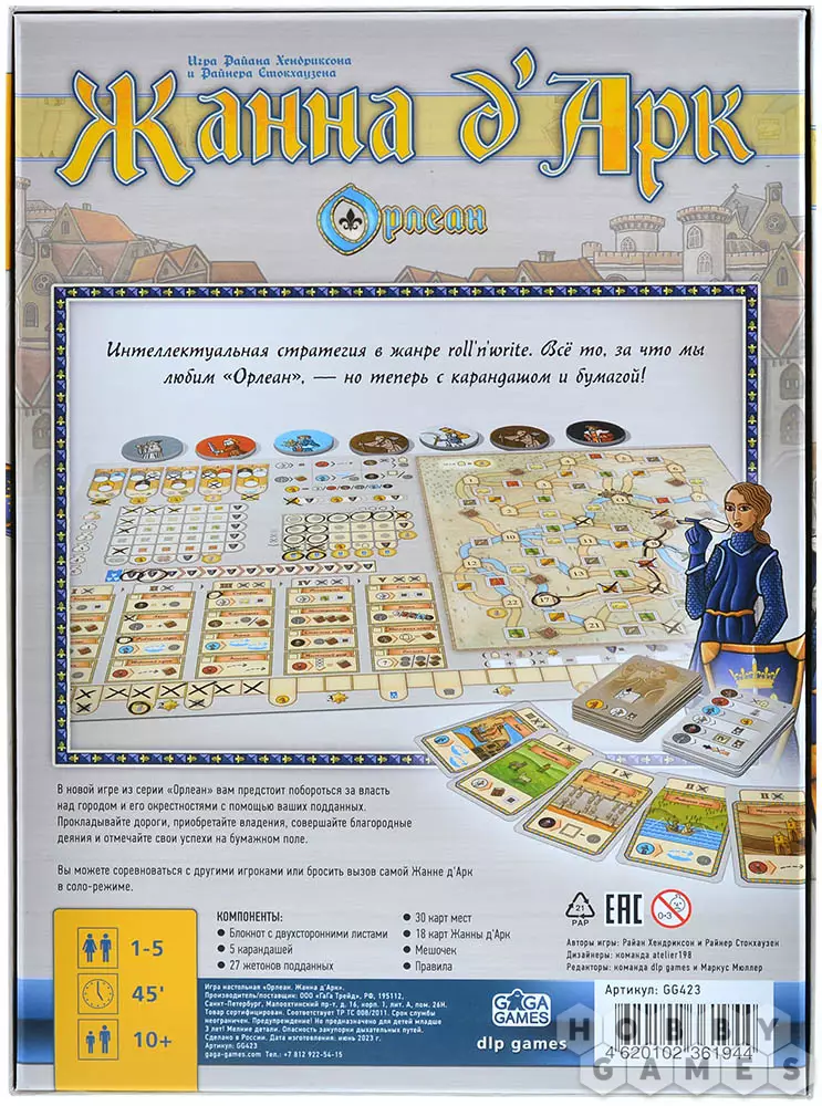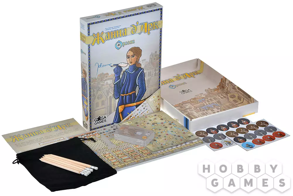 "Жанна д'Арк" – это упрощённая версия настольной игры "Орлеан" в совершенно ином жанре: всё, что происходит в игре, вы записываете на специальном листе. В остальном же это всё та же крепкая стратегия, что и её старший брат (разве что теперь в игре нет механики "построения мешка"). Вам по-прежнему предстоит строить наиболее выгодную стратегию действий и конкурировать с оппонентами за выгодные жетоны. А если захотите, можете вступить в схватку с самой Жанной д'Арк в режиме игры на одного.
