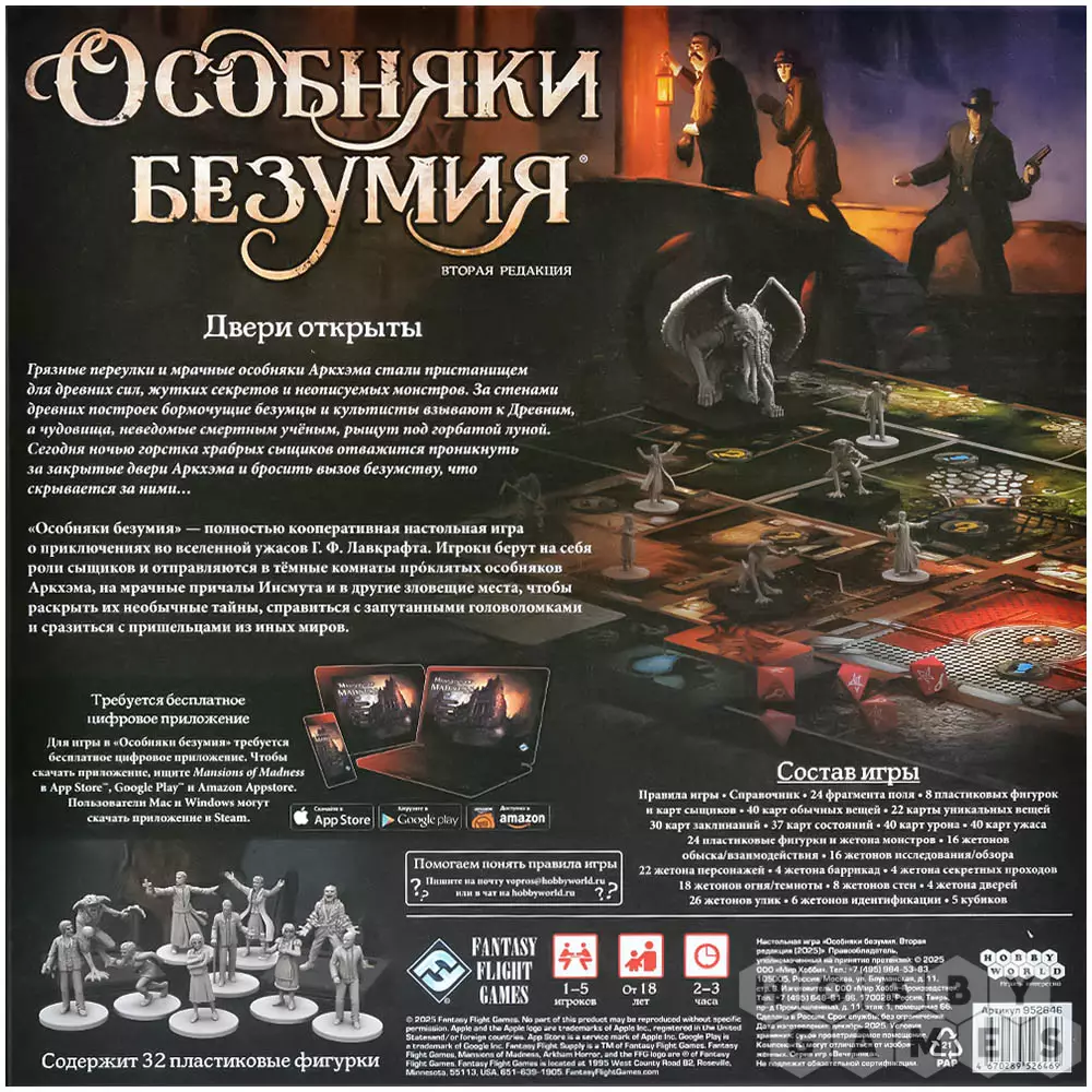 Обратите внимание! Требуется бесплатное цифровое приложение! Для игры в "Особняки безумия" требуется бесплатное цифровое приложение. Чтобы скачать приложение, ищите Mansions of Madness в App Store™, Google Play™ и Amazon Appstore. Пользователи Mac и Windows могут скачать приложение в Steam.