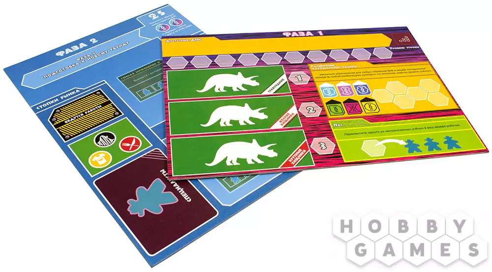 Фаза исследований – в эту фазу игроки могут исследовать новое ДНК и получить его как ресурс, расширить холодильные камеры для хранения ДНК или получить геном одного из динозавров. Новый геном пригодится для выведения нового вида динозавра. Каждый игрок должен совершить по три действия или спасовать