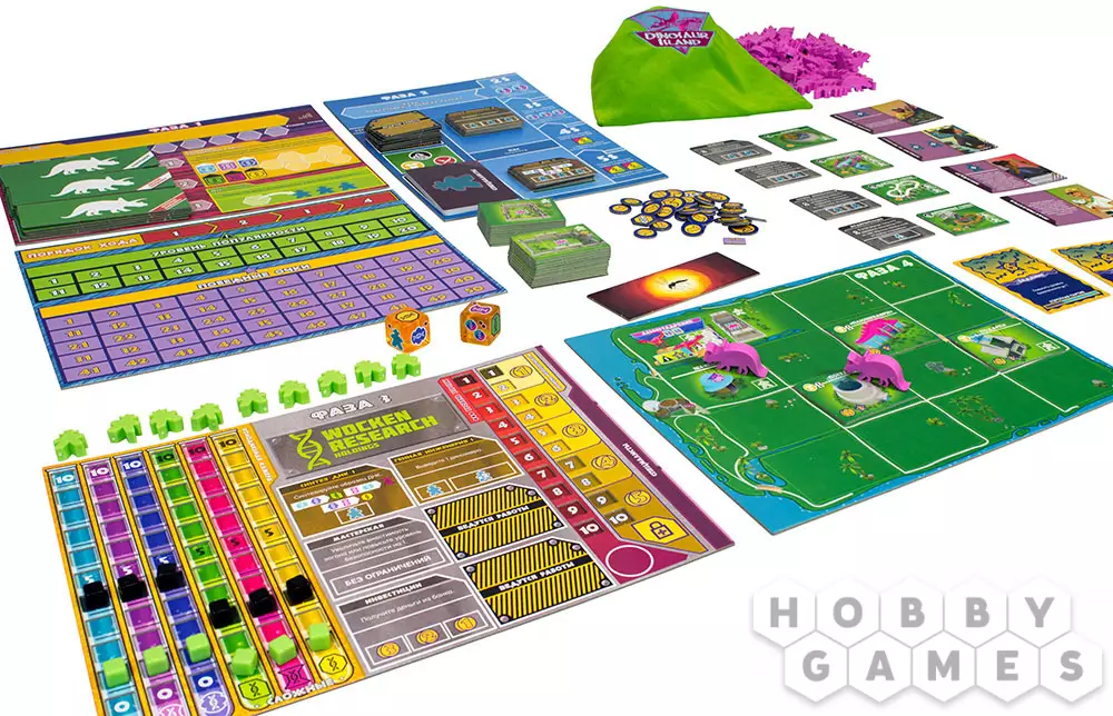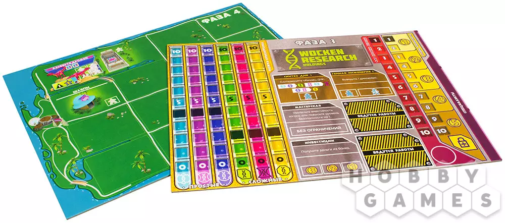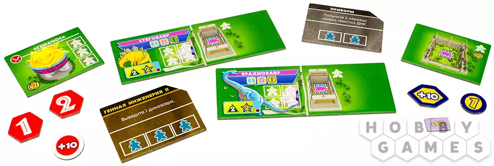 Каждый игрок получает в своё распоряжение планшеты лаборатории и парка, начальный капитал в 15$, рабочих с учёными, стартовые образцы ДНК динозавров.