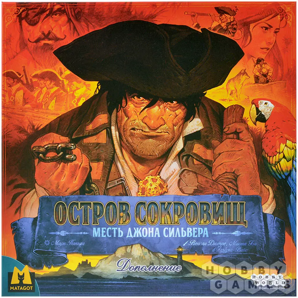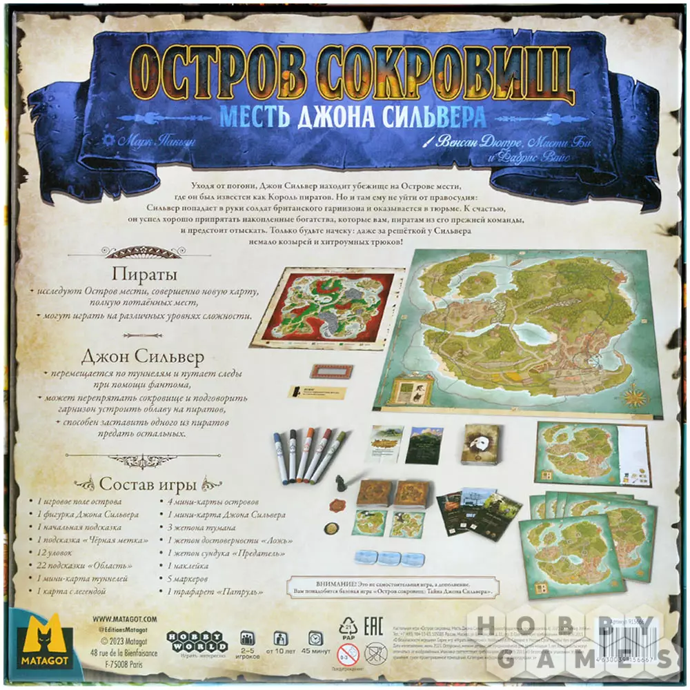 "Месть Джона Сильвера" – это долгожданное дополнение для "Острова сокровищ: Тайна Джона Сильвера". Оно включает в себя 2 новых модуля, которые можно добавлять в игру как по отдельности, так и оба сразу. Модуль "Новые острова", как понятно из названия, отправит вас на поиски сокровищ по двум новым картам: обновлённая карта из базовой игры и карта острова Мести. А вместе и с новыми картами в игру добавляются и 11 новых подсказок.
