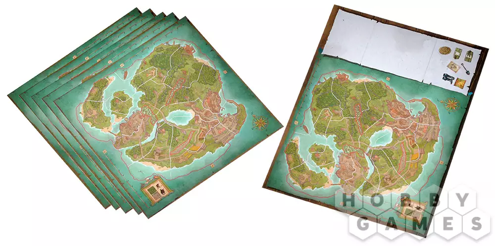 Игровая комплектация чрезвычайно красива и антуражна – внутри вы найдёте красивые ширмы для игроков, прекрасную двухстороннюю карту острова, сундучок, специальные линейки, маркеры, циркуль и многое-многое другое! Ваше путешествие будет по-настоящему ярким и незабываемым!