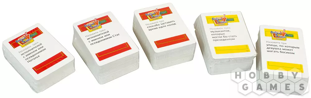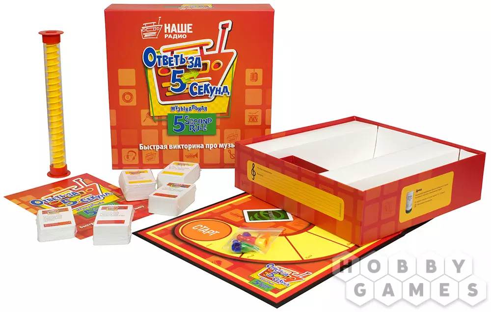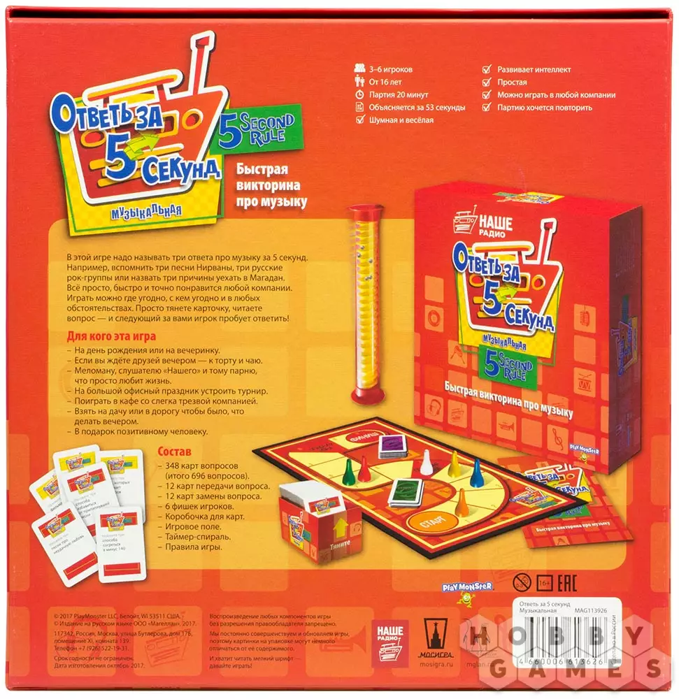 "Ответь за 5 секунд" – это скоростная и уморительная викторина для задорной компании. Простые правила позволяют быстро включиться в игру – тяните карточку, зачитывайте вопрос, а следующий игрок должен быстро на него ответить. Как следует из названия игры, ответить нужно за пять секунд, отмерить время поможет необычный таймер-спираль с металлическими шариками, который отсчитывает время, издавая смешной звук.