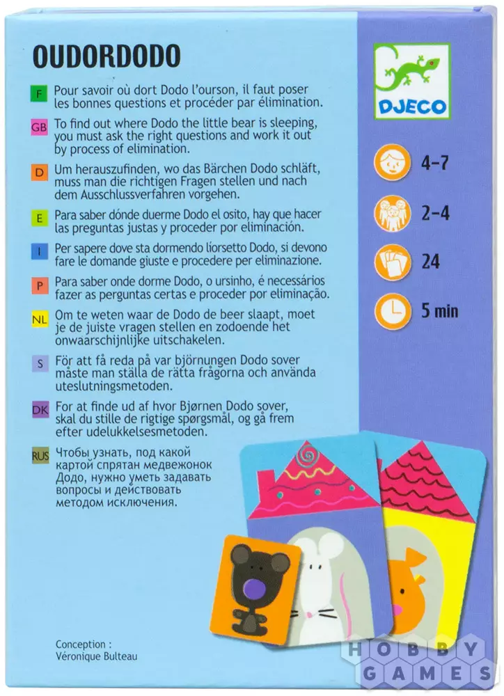 Oudordodo – забавная игра-угадайка для малышей. В коробочке 24 карты с рисунками: домики, медвежата Додо (для партии понадобится только одна) и жетончики. Каждый раунд один из игроков берёт на себя роль ведущего. Он должен спрятать карточку с Додо под одной из карт с домиками, а остальные игроки угадывают – где Додо? Угадавший получает жетон, и раунд завершается. В следующем раунде выбирается другой ведущий. Игра продолжается до тех пор, пока один из игроков не соберет 5 жетонов, он в результате и побеждает.