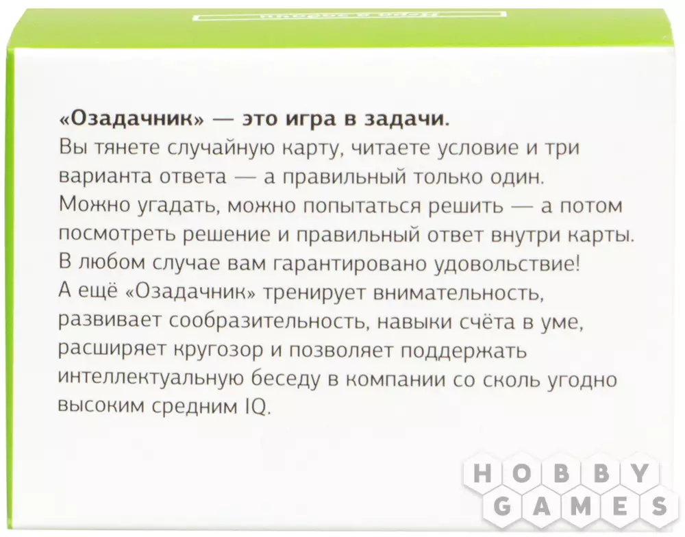Любите разминать мозги? Тогда вы выбрали правильную игру-викторину! Сложные вопросы с трудными задачами являются визитной карточкой "Озадачника". Принципы любой из игр этой серии просты – тяните карту и читайте вопрос. На обратной стороне карточки есть три варианта ответа, а ответ на вопрос находится внутри карточки. Если хотите ещё больше усложнить задачку, то постарайтесь ответить не глядя в варианты ответов.