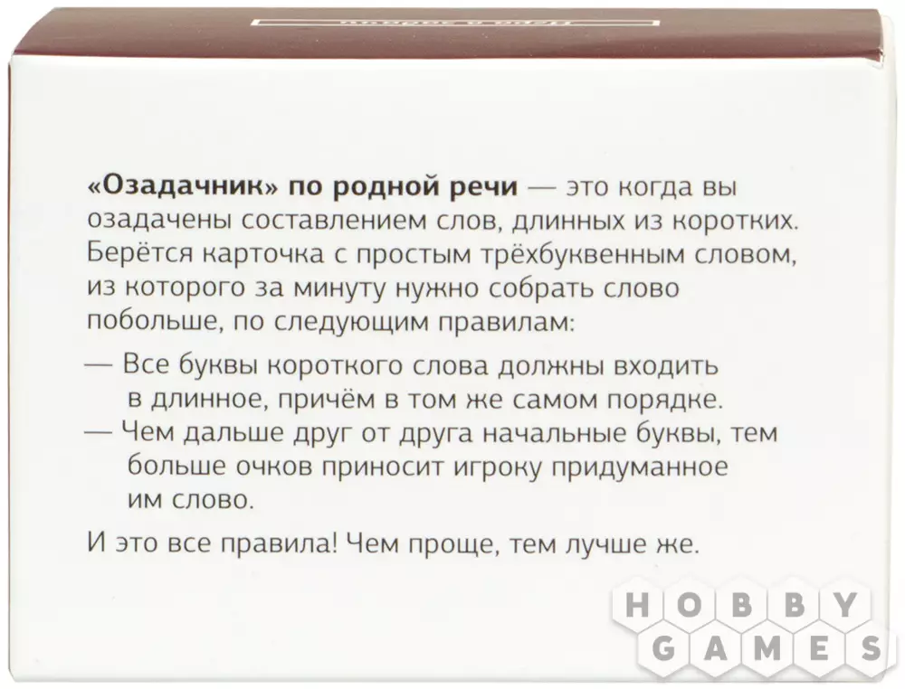 "Озадачник. Родная речь" отличается от других игр серии, так как в нём нет вариантов ответа, зато свобода творчества сильно выше. Чтобы заработать очки, придётся составлять длинные слова из букв коротких слов, написанных на карточке. Если хотите задание посложнее, то старайтесь придумывать слова так, чтобы между начальными буквами было как можно больше новых букв.