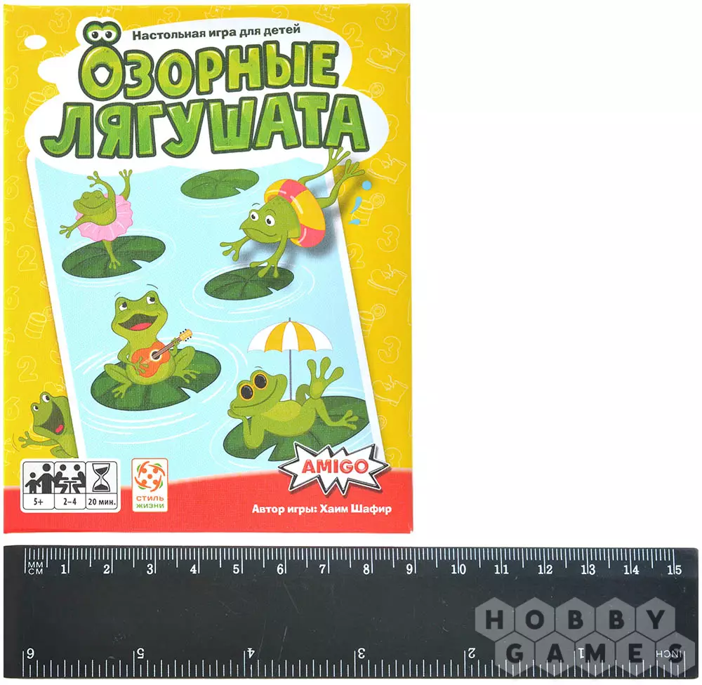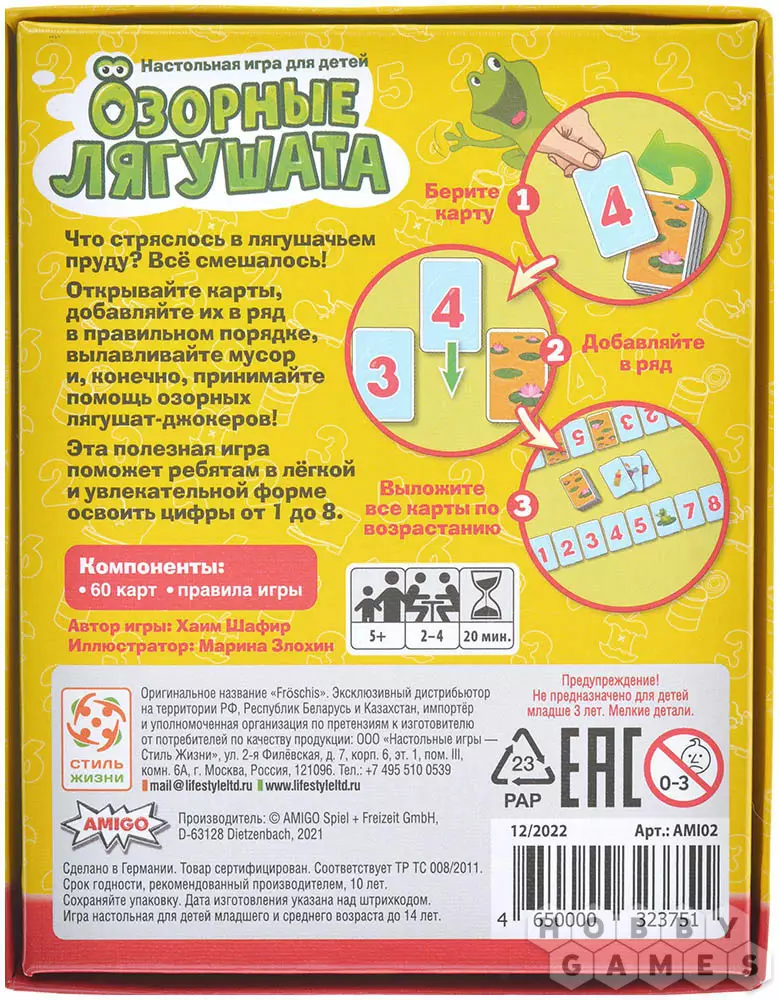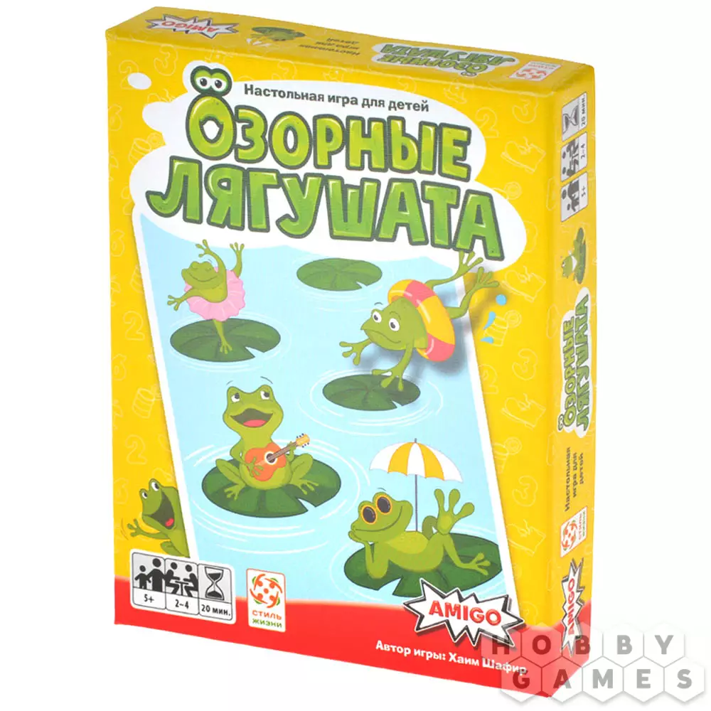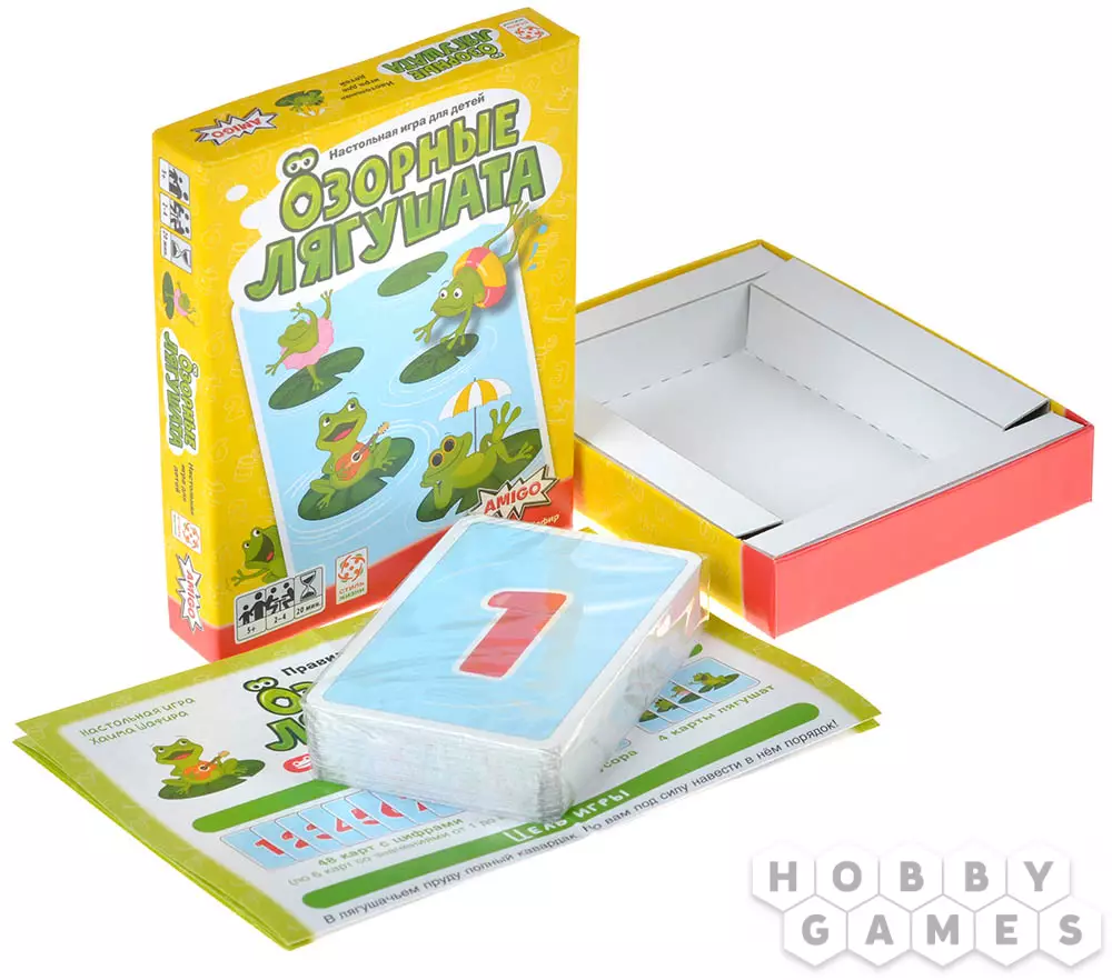 "Озорные лягушата" – это детская карточная игра, которая увлечёт самых юных игроков и поможет родителям обучить их устному счёту. Правила игры очень простые, а партии проходят быстро и увлекательно: В самом начале перед всеми игроками лежат 8 карт в закрытую, то есть рубашкой вверх. В свой ход игроки вытягивают одну карту из общей стопки в центре стола. На карте может быть изображена цифра от 1 до 8, лягушка или мусор. Если вытянули карту с цифрой – поместите её в своё ряд на место, соответствующее цифре на карте. Если вытащили карту с мусором, то ваш ход мгновенно завершается и переходит к следующему игроку. Как только один из игроков выкладывает последнюю карту в свой ряд в открытую, раунд завершается. Все игроки, собравшие ряд по порядку, в следующем раунде составляют ряд на одну карту меньше.