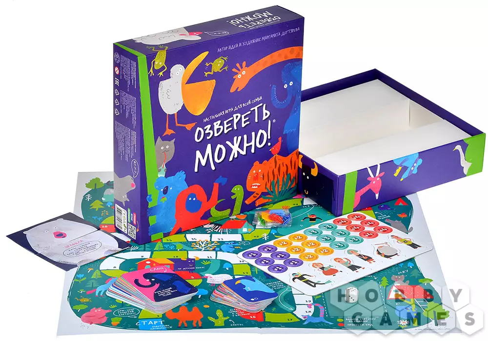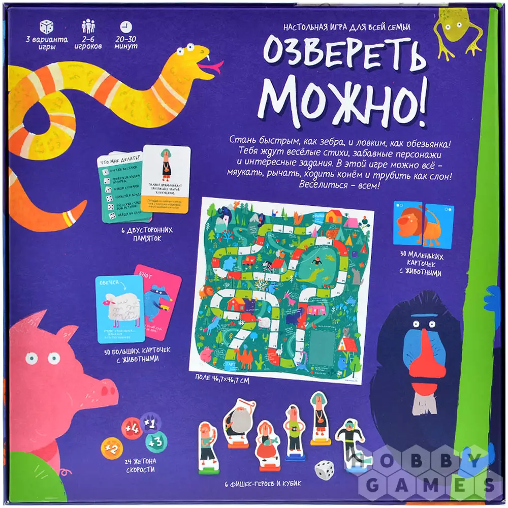 "Озвереть можно" сочетает в себе активные задания, гонку на скорость и даже первую стратегию для детей – отличный старт для будущих тактиков и любителей сложных вызовов! Выполняйте смешные задания, собирайте карточки и зарабатывайте жетоны скорости. Красочные иллюстрации, рифмованные подсказки и весёлые испытания сделают процесс игры незабываемым. А ещё приготовьтесь перевоплощаться в милых зверят, ведь здесь придётся не просто угадывать животных, но и полностью вживаться в их роль! Мяукать, рычать, прыгать, трубить хоботом – здесь возможно всё. Детям точно понравится участвовать, а взрослым будет весело наблюдать – ну или тоже присоединиться к веселью!