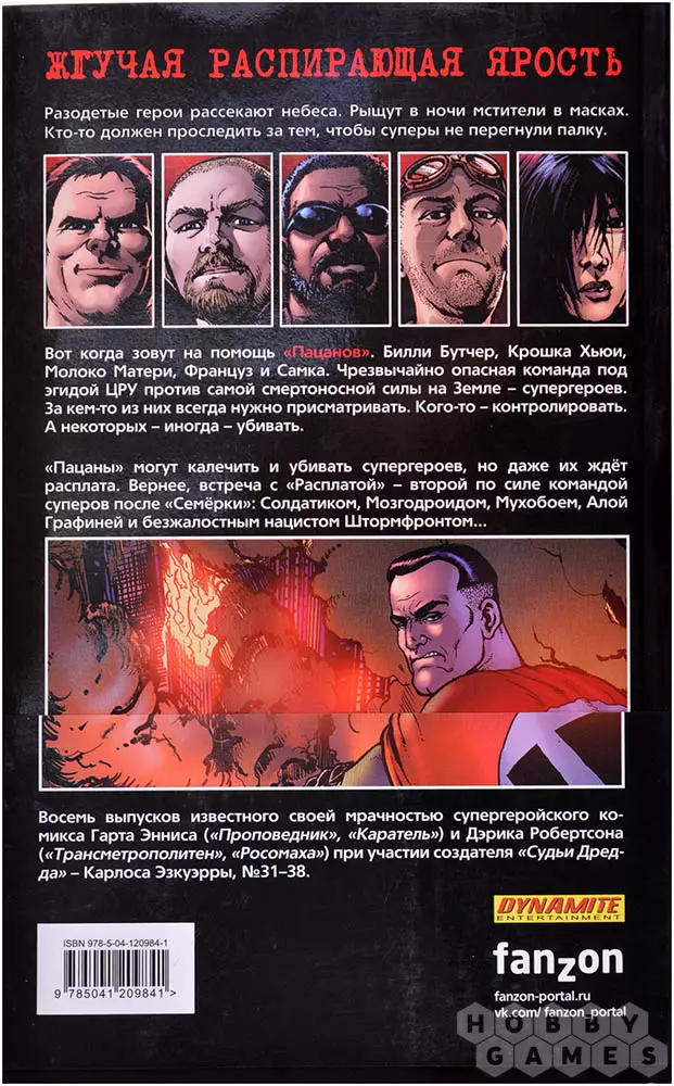 Добро пожаловать в мир, где супергерои – никакие не герои, а звёзды, приносящие своим компаниям гигантскую прибыль. Каждый из них не просто обладает сверхъестественными способностями, а ещё и является настоящим брендом с личной пиар-службой и сотнями тысяч поклонников. Прекрасные, богатые и смертоносные "суперы", конечно, относятся к жизням простых людей без особого трепета, а когда сами совершают преступления – выходят сухими из воды. Как можно это изменить, как привлечь к ответственности почти неуязвимых полубогов, многие из которых способны уничтожить отряд полиции за доли секунды? Эксперты в этом вопросе – команда "Пацаны", простые люди, не обладающие (ну почти) никакими сверхспособностями. Коварный и жестокий Билли Бутчер, невозмутимый Молоко Матери, гениальный Француз, сверхсильная Самка и наивный Малыш Хьюи – вот гроза супергеройского мира. В недавно переведённых выпусках комикса "Пацаны" вы можете познакомиться с этой разношёрстной командой, узнать историю каждого из них и насладиться их безбашенными приключениями!