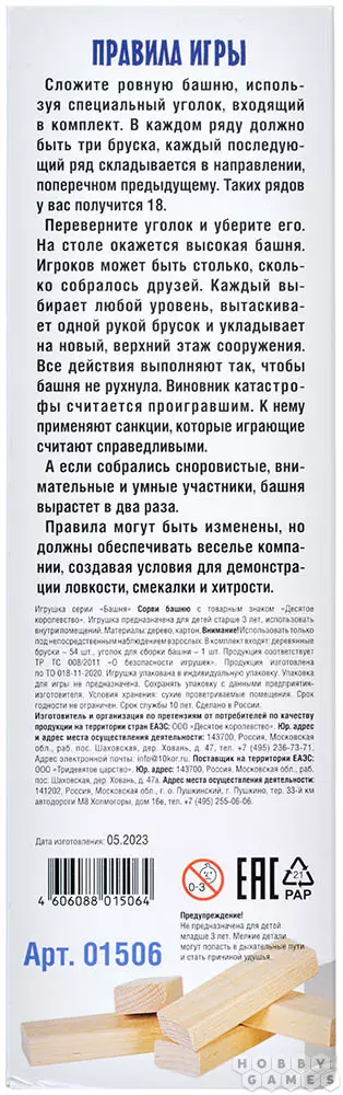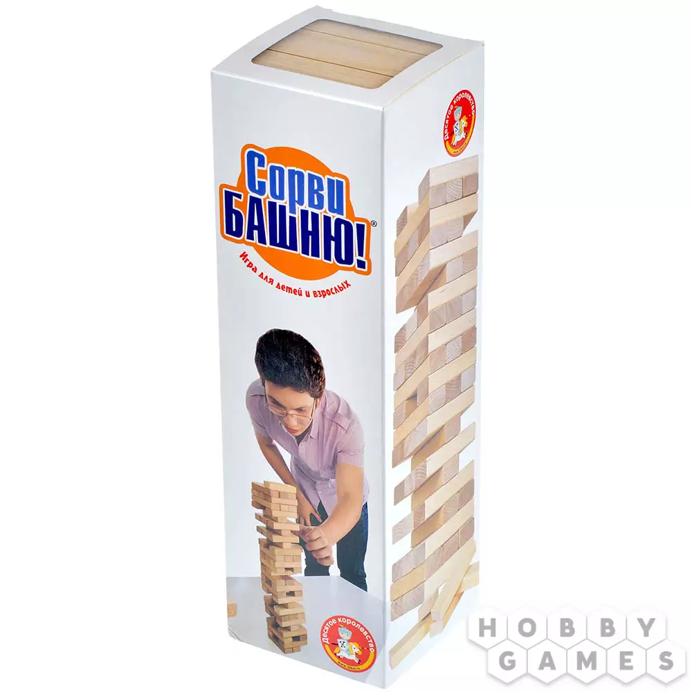 Соберите деревянную башню и одной рукой тяните из неё по очереди по одному бруску, не трогая два верхних уровня. Вытянутый брусок необходимо поставить на самый верх конструкции. После чего ход переходит к следующему игроку. И так ход за ходом до тех пор, пока ваше совместное творение не рассыпется по всему столу. Тот из игроков, от чьей нетвёрдой руки рухнула ваша башня, объявляется проигравшим и выстраивает конструкцию заново для следующей партии.